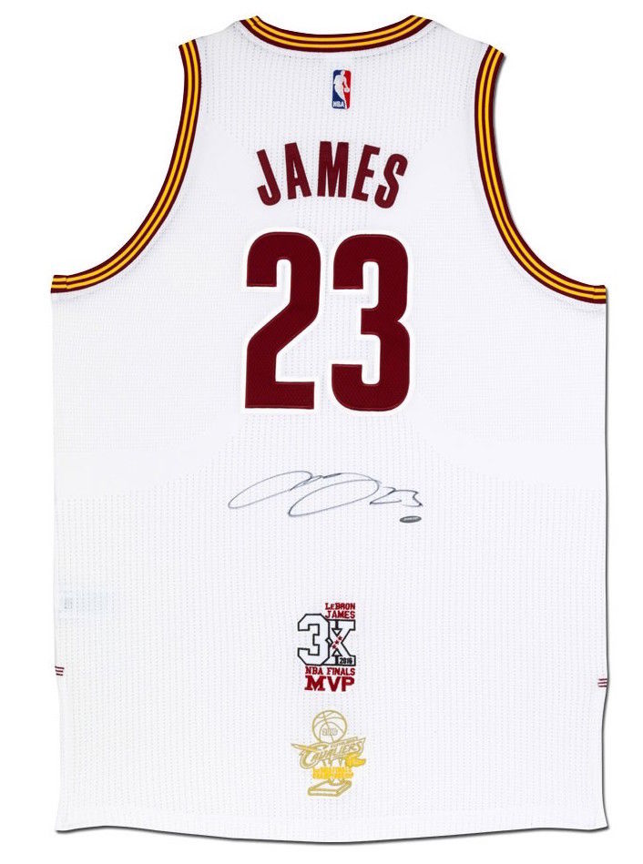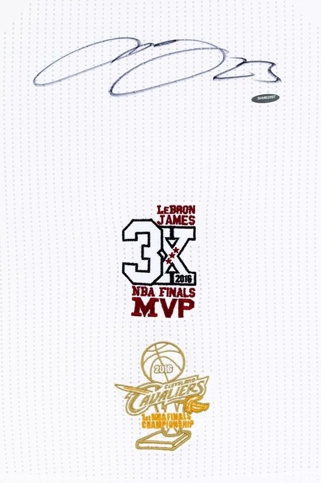 The 2016 NBA Finals represented the second consecutive trip to the promised land for the Cleveland Cavaliers and the sixth straight Finals appearance for LeBron James, which at the time was an NBA record for players not on the Boston Celtics teams of the 1960s. But the task ahead of them was monumental. The opponent was the defending champion Golden State Warriors, one of the greatest teams ever assembled. The Warriors jumped out to 2-0 and 3-1 series leads and looked to make it back-to-back titles as they only needed one win in the final three games, two of which were at home. But that's when James took over. He scored 41 points with 16 rebounds in Game 5 with 41 points, 11 assists and eight rebounds in Game 6 to set up an epic Game 7 matchup. In one of the best playoff games in NBA history, James poured in 27 points with 11 rebounds and 11 assists to lead the way to a 93-89 win. He became the third player in NBA history to record a triple-double in a Finals Game 7 as he earned MVP honors. To celebrate James capturing his third Finals MVP Award and the Cavs winning their first championship, Upper Deck Authenticated has produced this autographed authentic jersey with a pair of one-of-a-kind logo patches sewn onto the back underneath James' signature. These uniquely designed logos honor King James capturing his third Finals MVP trophy as well as the Cavaliers first-ever championship. James has signed this authentic Adidas Cleveland Cavaliers white jersey in silver paint pen. His signature is deemed authentic by virtue of Upper Deck Authenticated's Five-Step Process.