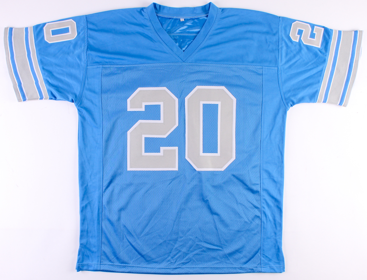 Custom on-field style jersey. Everything is sewn on, size XL. Hand-signed and inscribed in black felt-tip pen by Lem Barney (HOF).