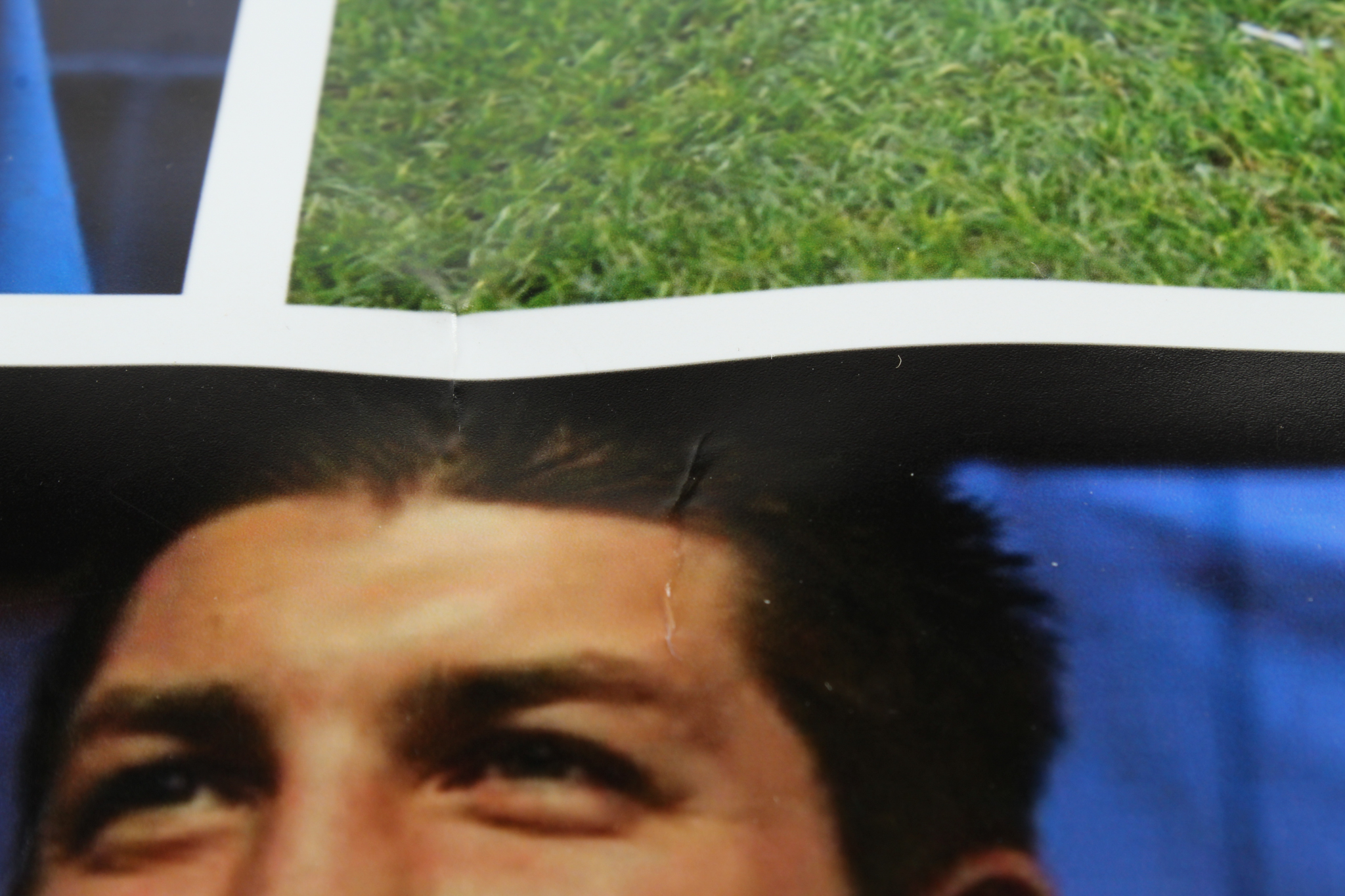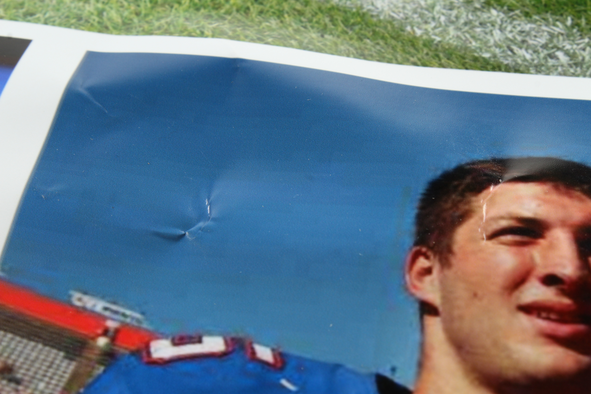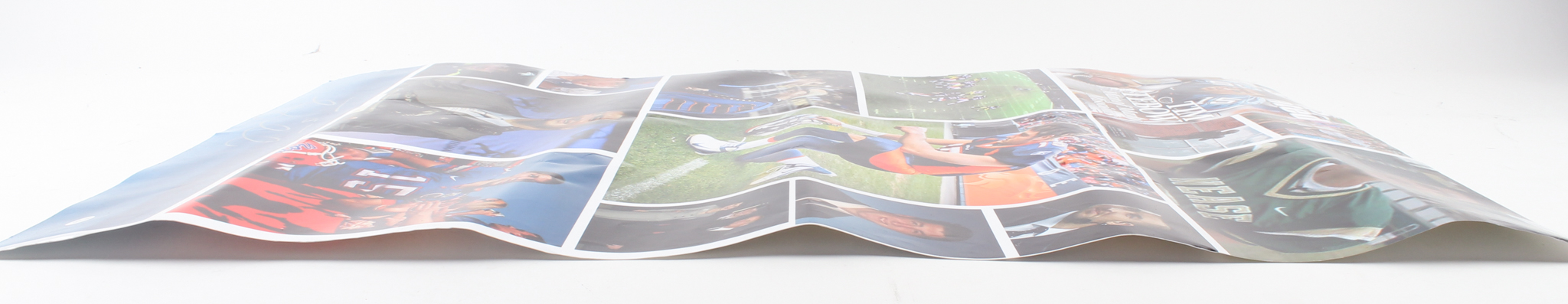 Custom Career Showcase Poster measures 24" x 35" in size. Hand-signed in silver paint pen by Tim Tebow (Broncos). Please note, the photo shows signs of wear.