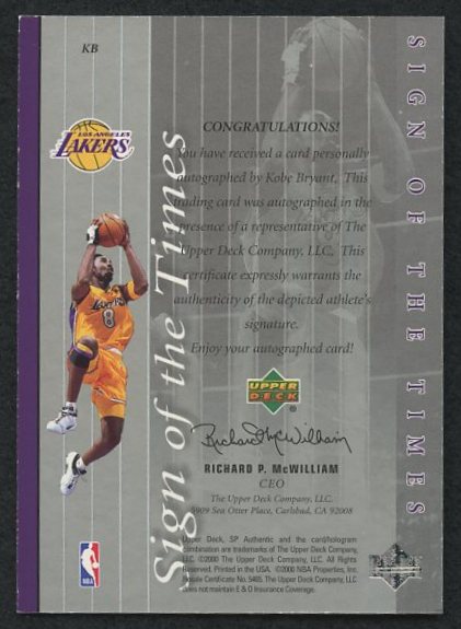 2000-01 SP Authentic Sign of the Times #KB Kobe Bryant Short Print (Lakers). On card autograph. Please see the scans below for details on the condition of the card.