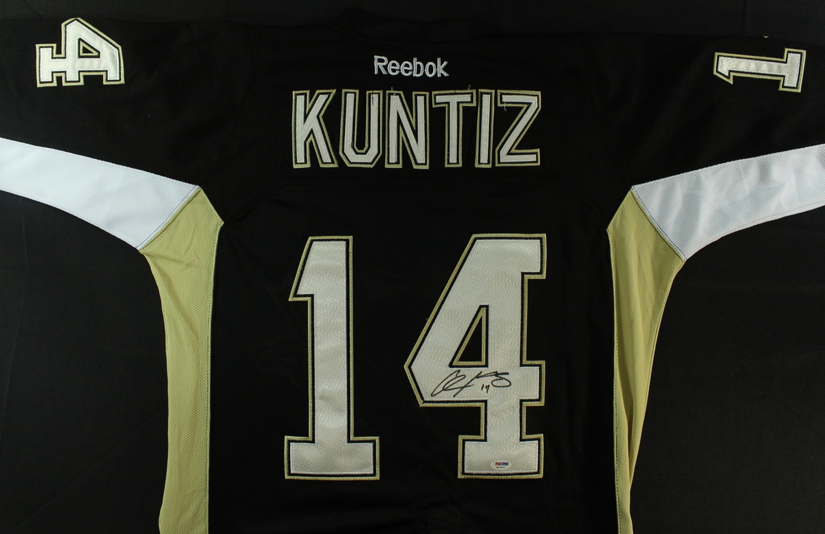 Reebok on-ice style jersey. Everything is sewn on, size 50. Hand-signed in black felt tip pen by Chris Kunitz. The autograph includes an official PSA/DNA hologram and matching COA for authenticity purposes.