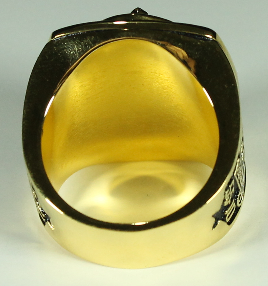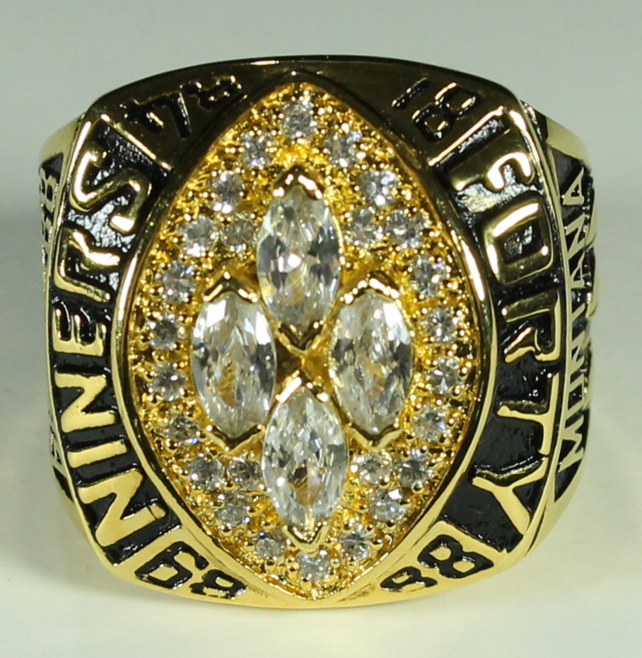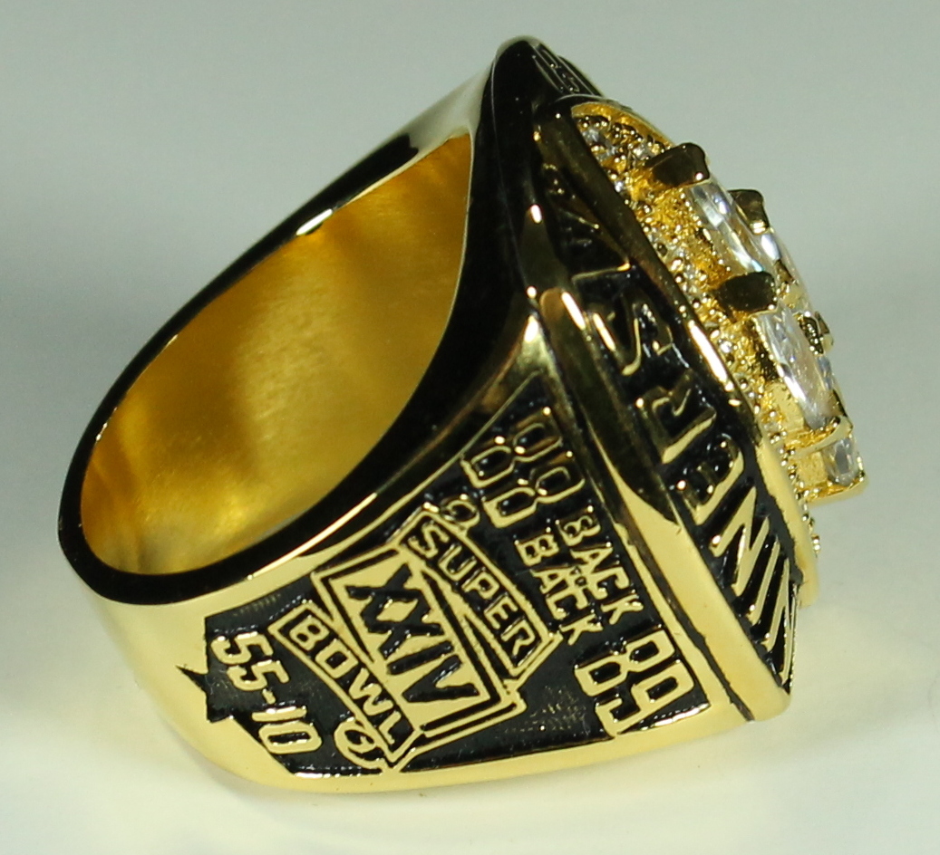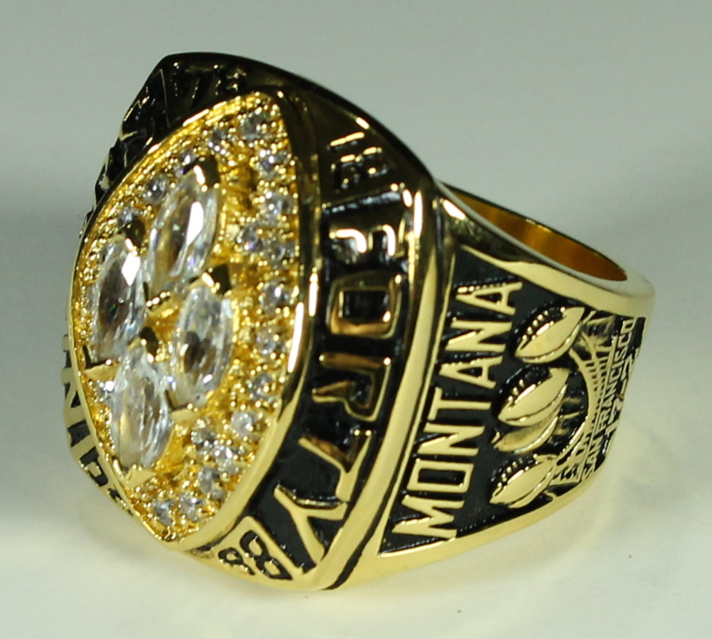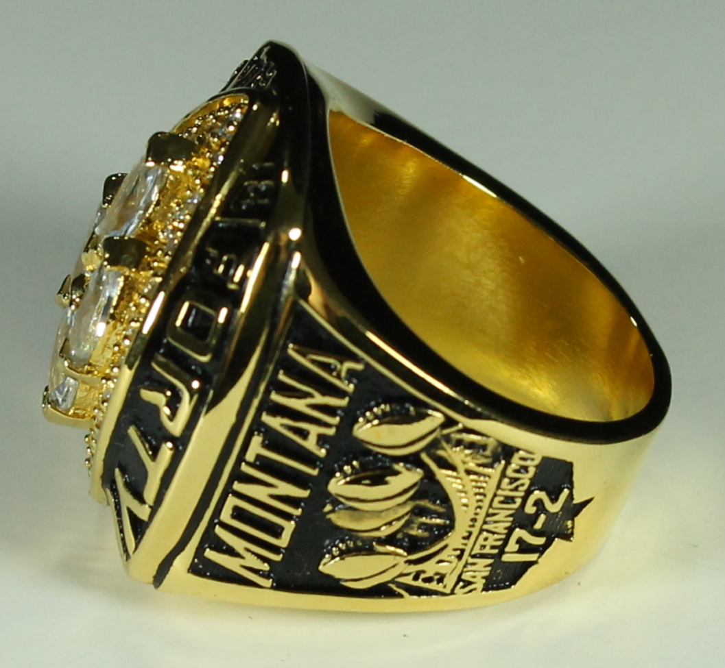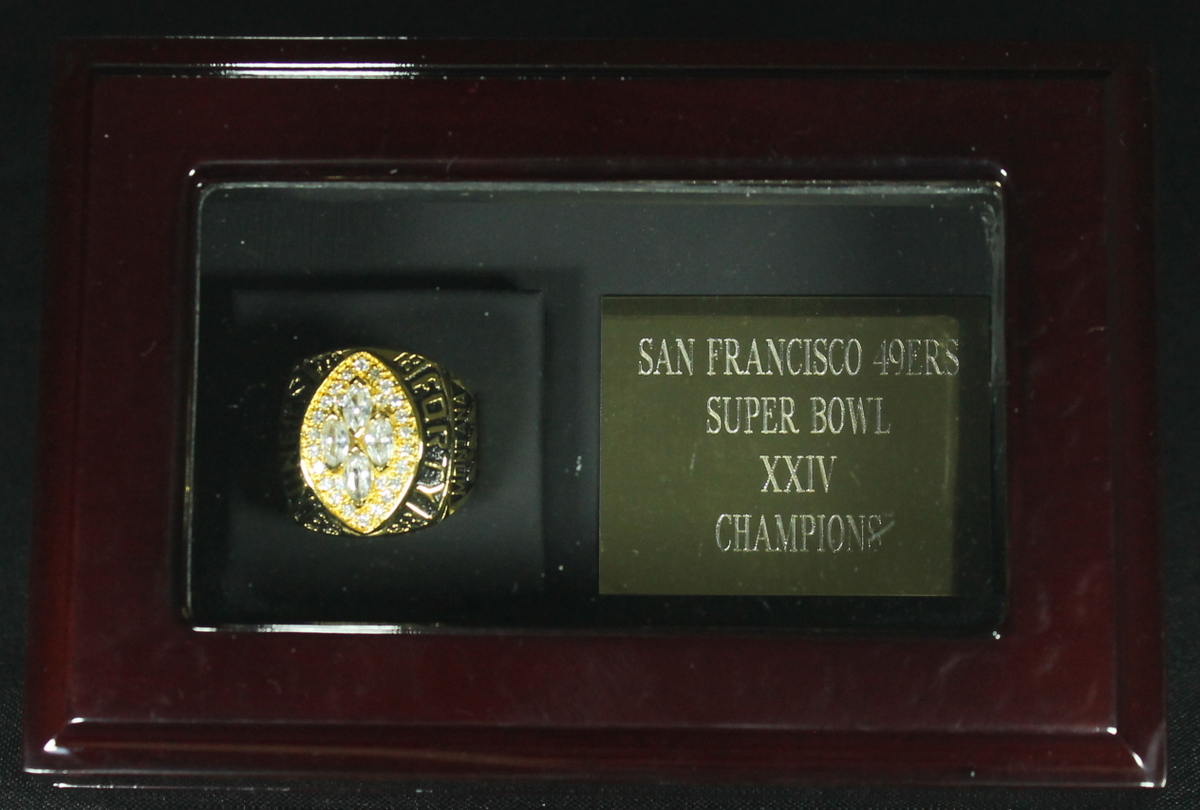 Joe Montana San Francisco 49ers High Quality Replica 1989 Super Bowl XXIV Championship Ring (High Quality Replica). The ring comes in a 6" x 4" x 2.5" cherry wood display box. The ring has been hand crafted by professional jewelers. Made of metal alloy and clad with 18 karat gold. Size 11.5.