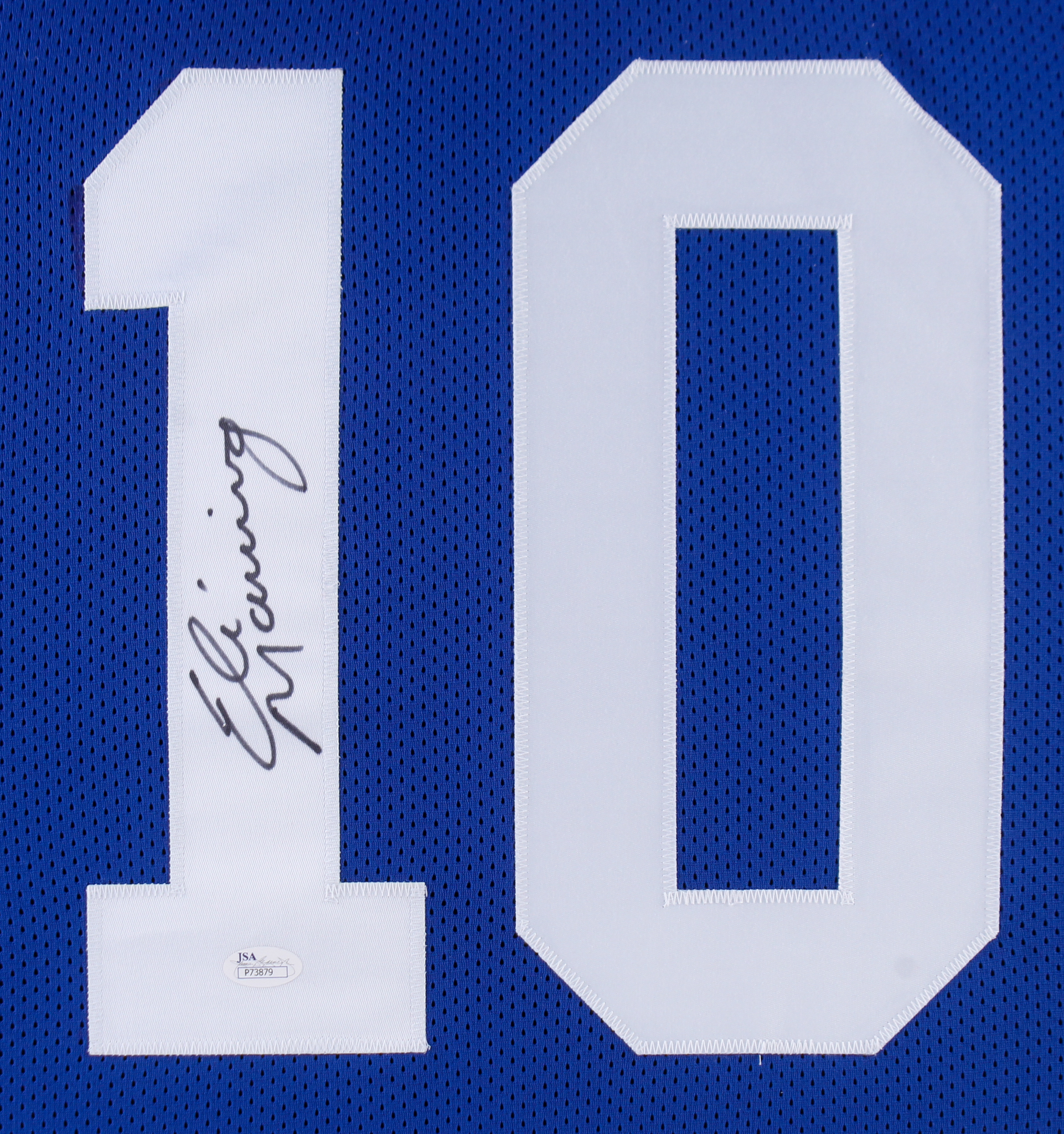 Custom frame measures approximately 31.5" x 35.5" in size and features a jersey which has been hand-signed in black felt-tip pen by Eli Manning.