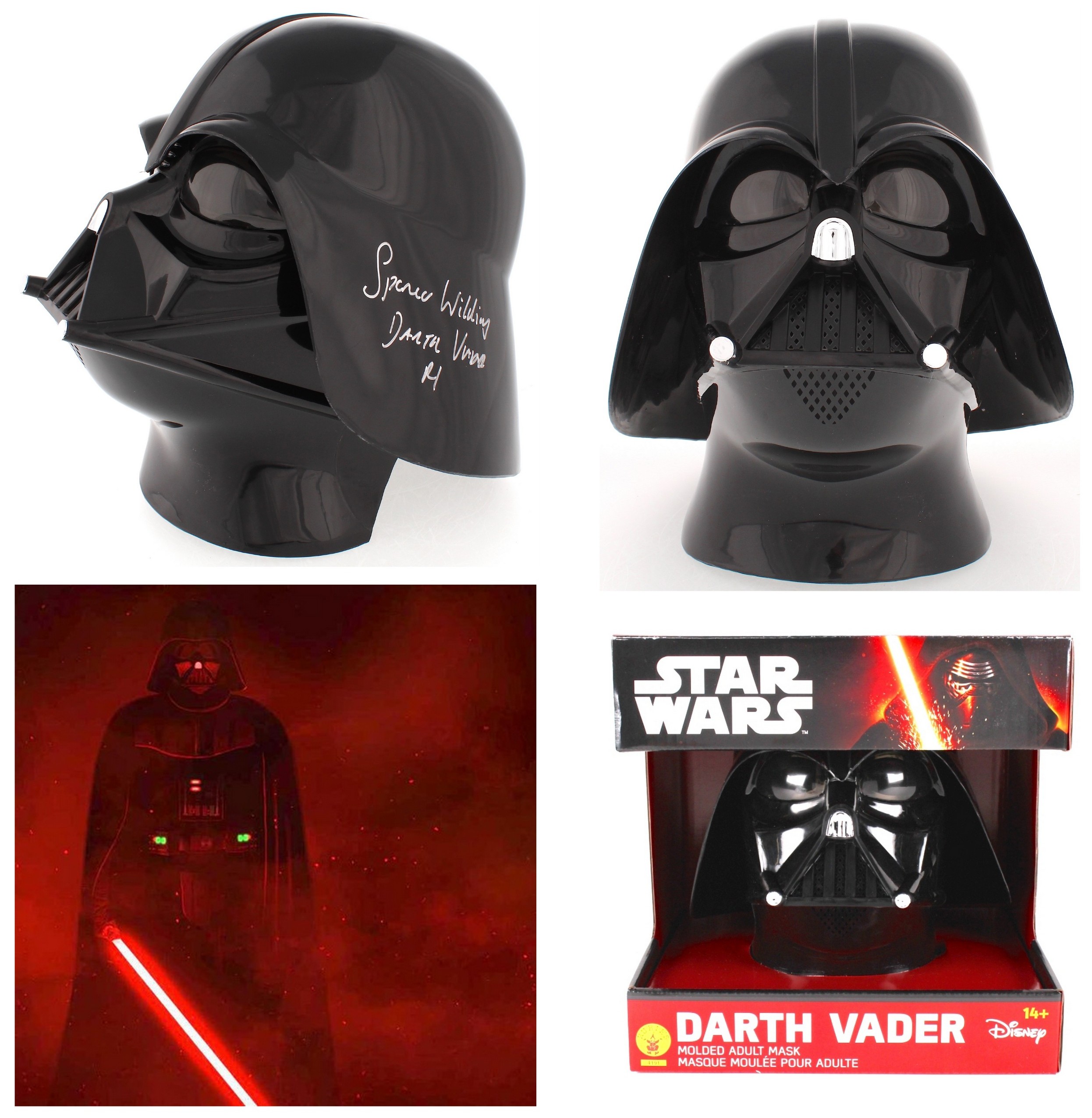Officially licensed Star Wars / Disney adult Darth Vader 2-piece mask / helmet. The helmet is hand-signed and inscribed in silver paint pen by Spencer Wilding who plays Darth Vader in Rogue One.