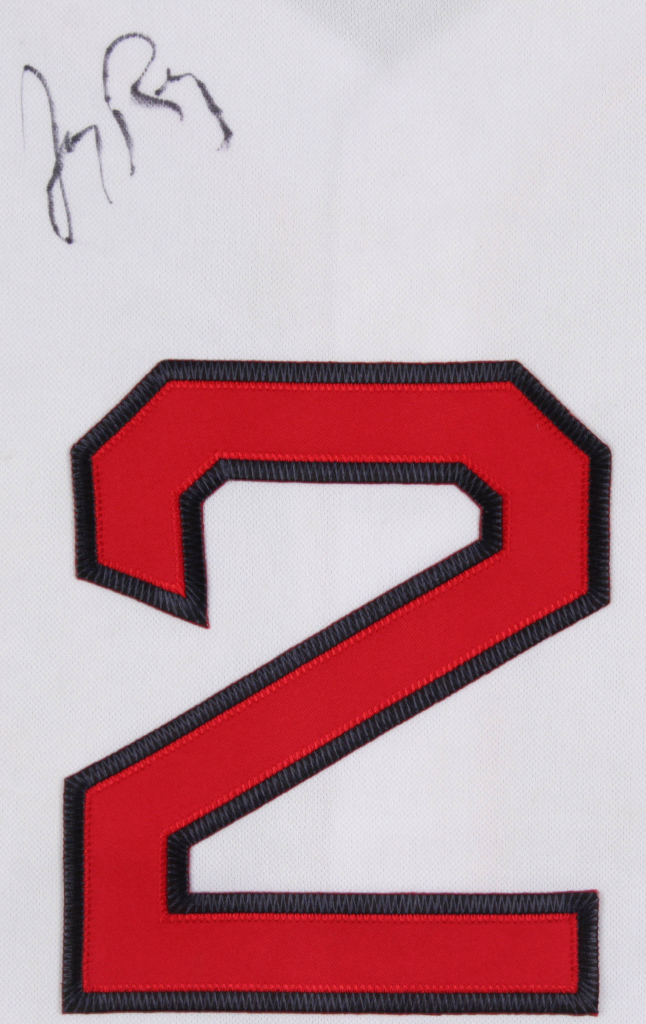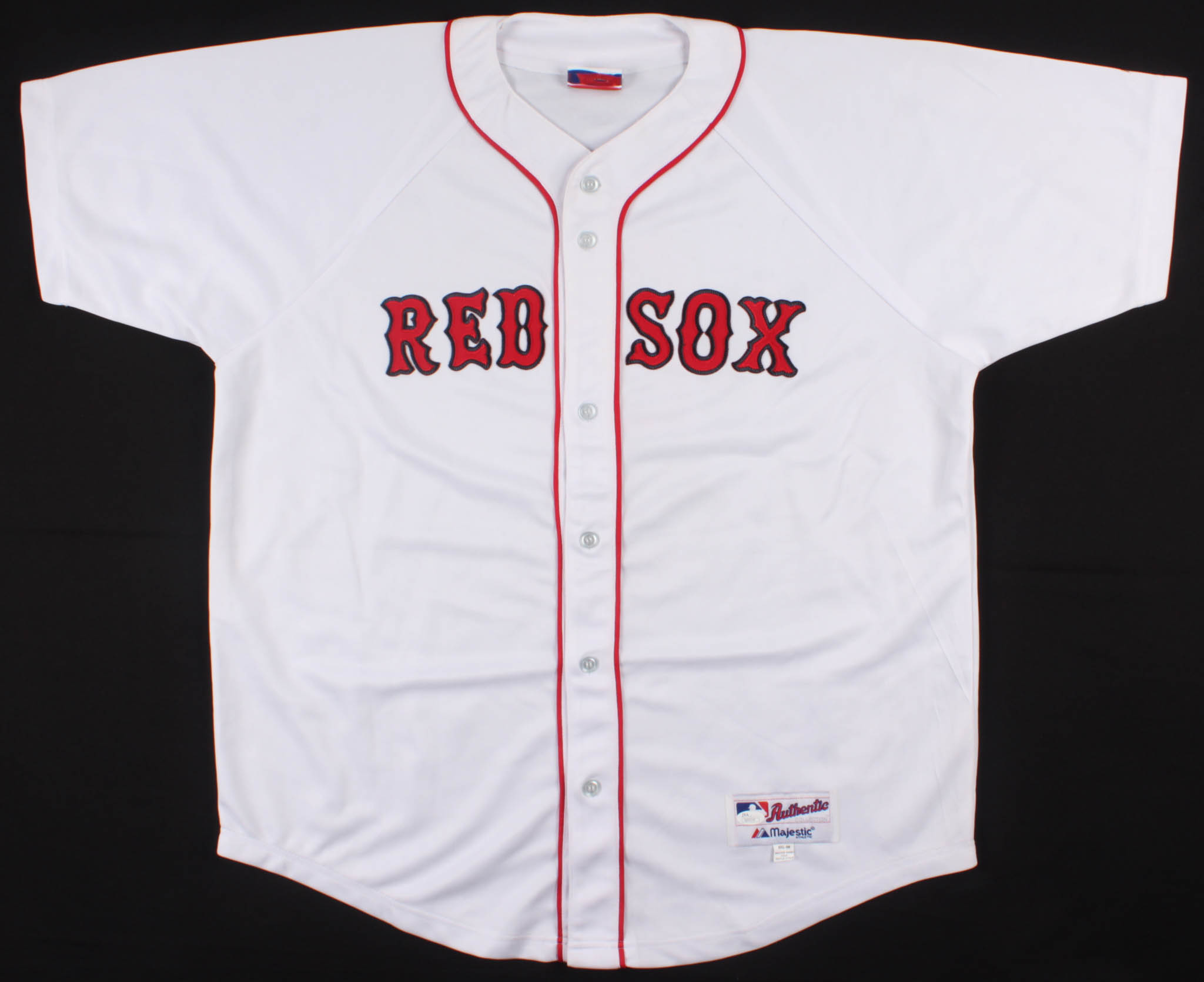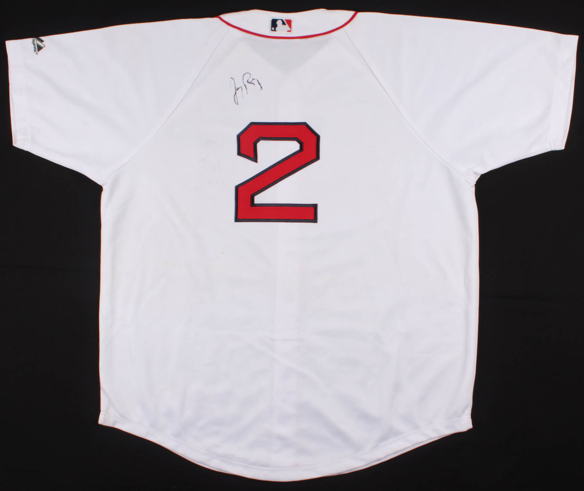 Majestic on-field style jersey. Everything is sewn on, size XXL. Hand-signed in black felt-tip pen by Jerry Remy. Please note, jersey shows signs of staining.