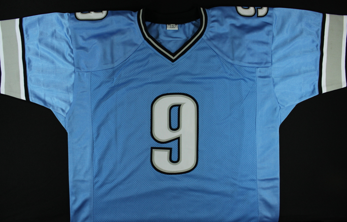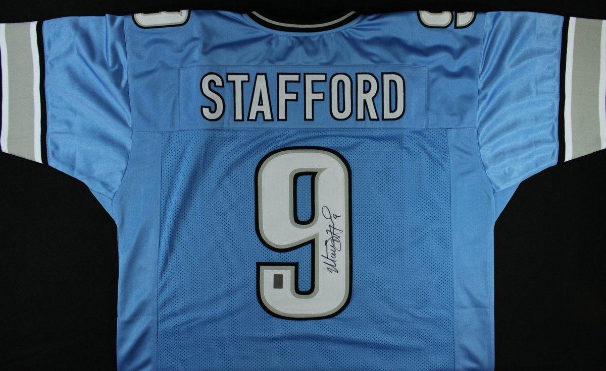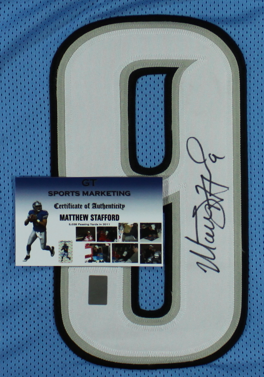 Custom on-field style jersey. Everything sewn on, size XL. Hand-signed in black felt tip pen by Matthew Stafford (Lions). Autograph includes an official GTSM Matthew Stafford hologram and COA for authenticity purposes.