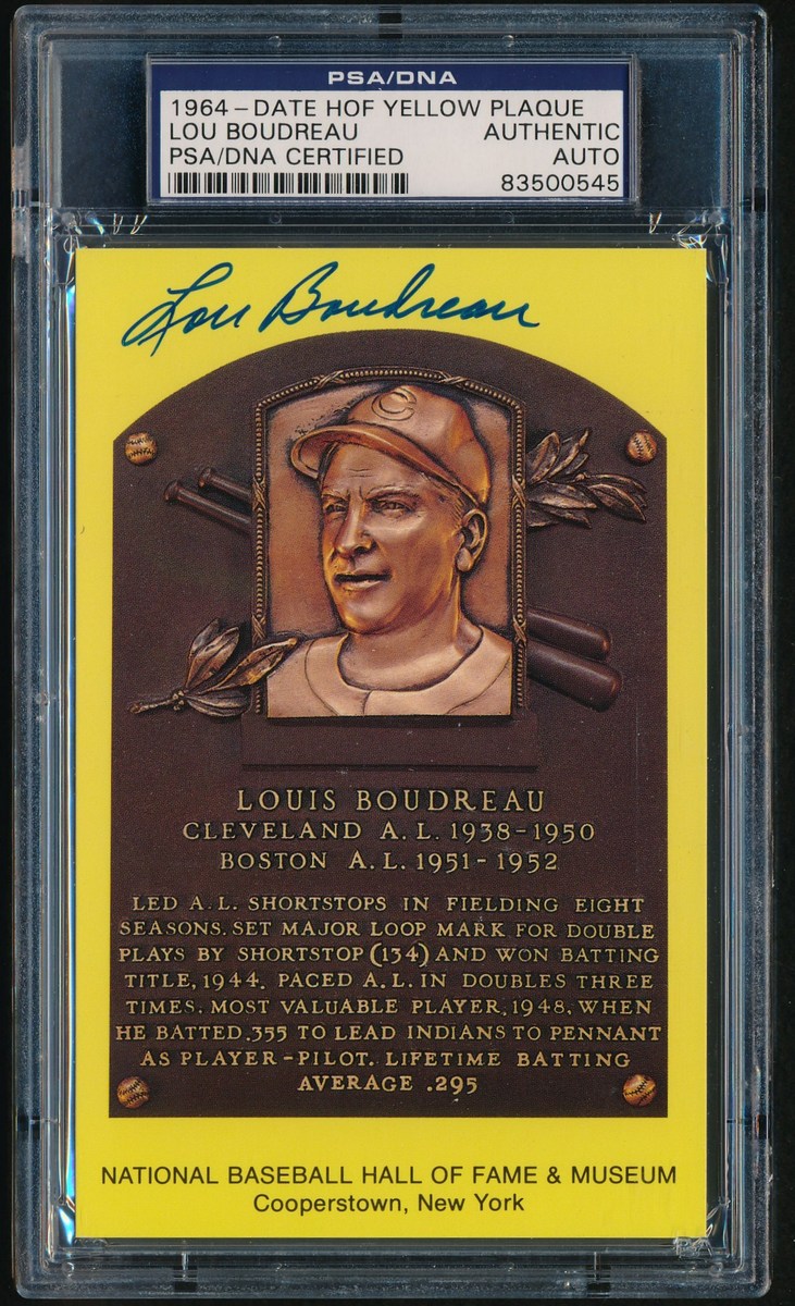 Hand-signed in blue felt tip pen by Lou Boudreau (D 2001, Indians HOF). Autograph has been encapsulated by PSA for authenticity purposes.
