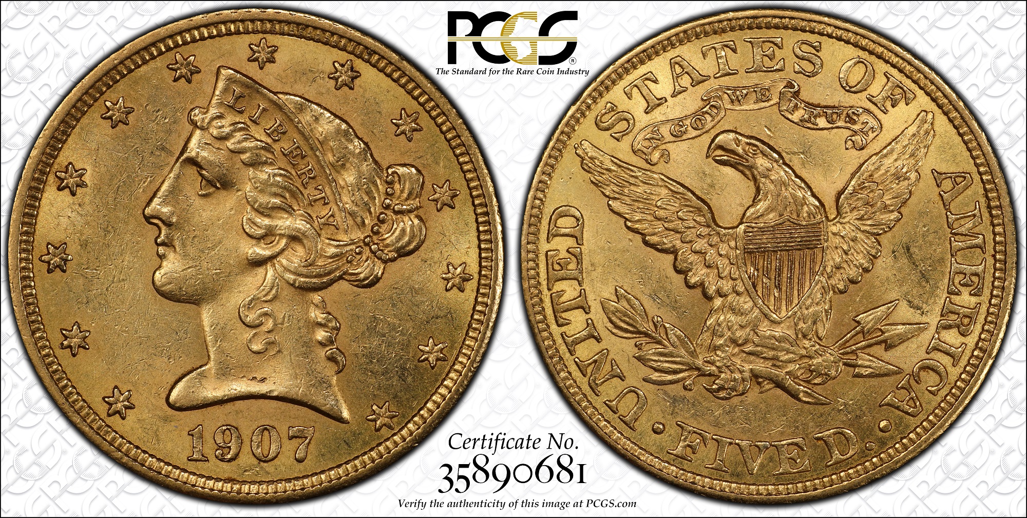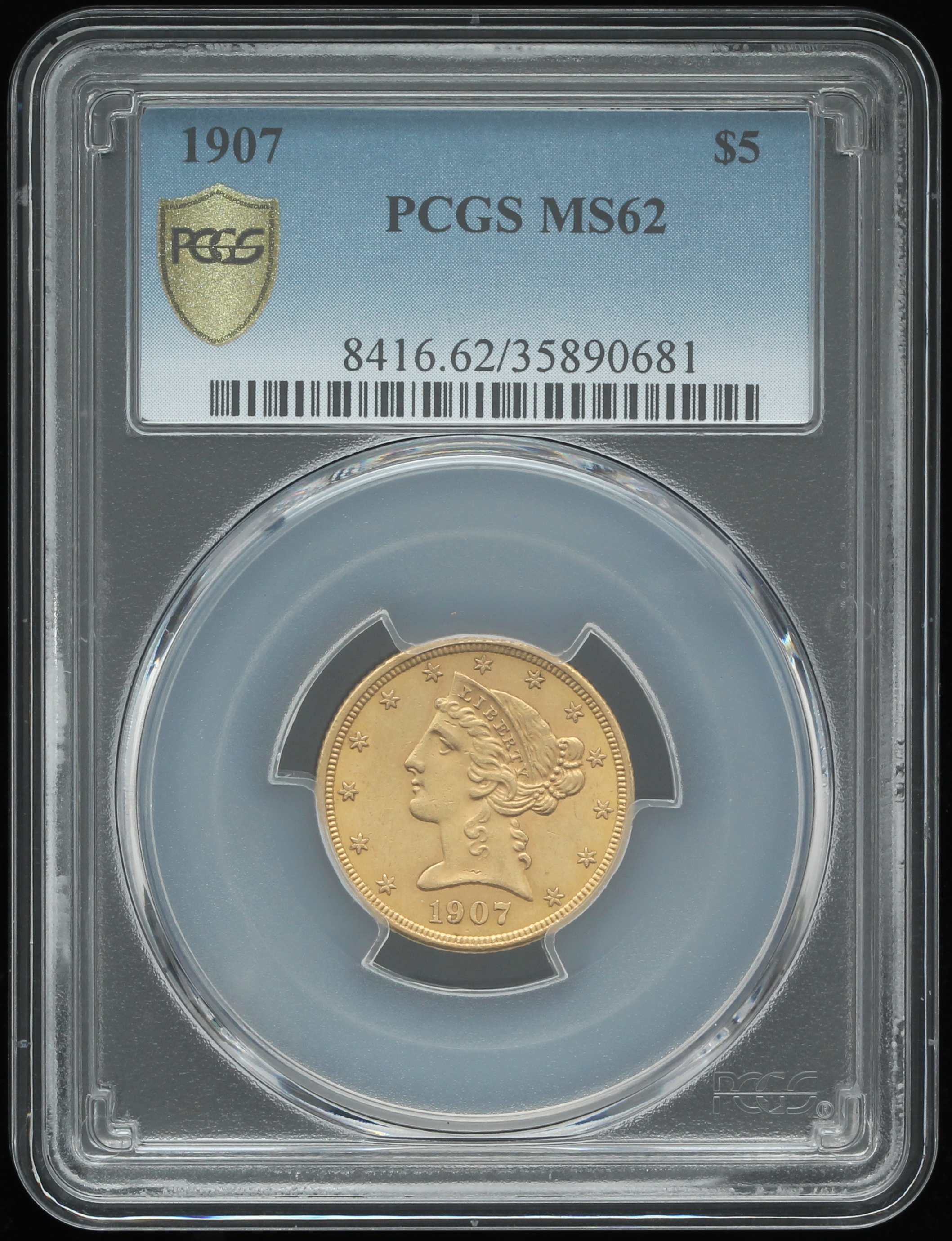 1907 $5 Five Dollars Liberty Head Half Eagle Gold Coin (PCGS Gold Shield MS 62)