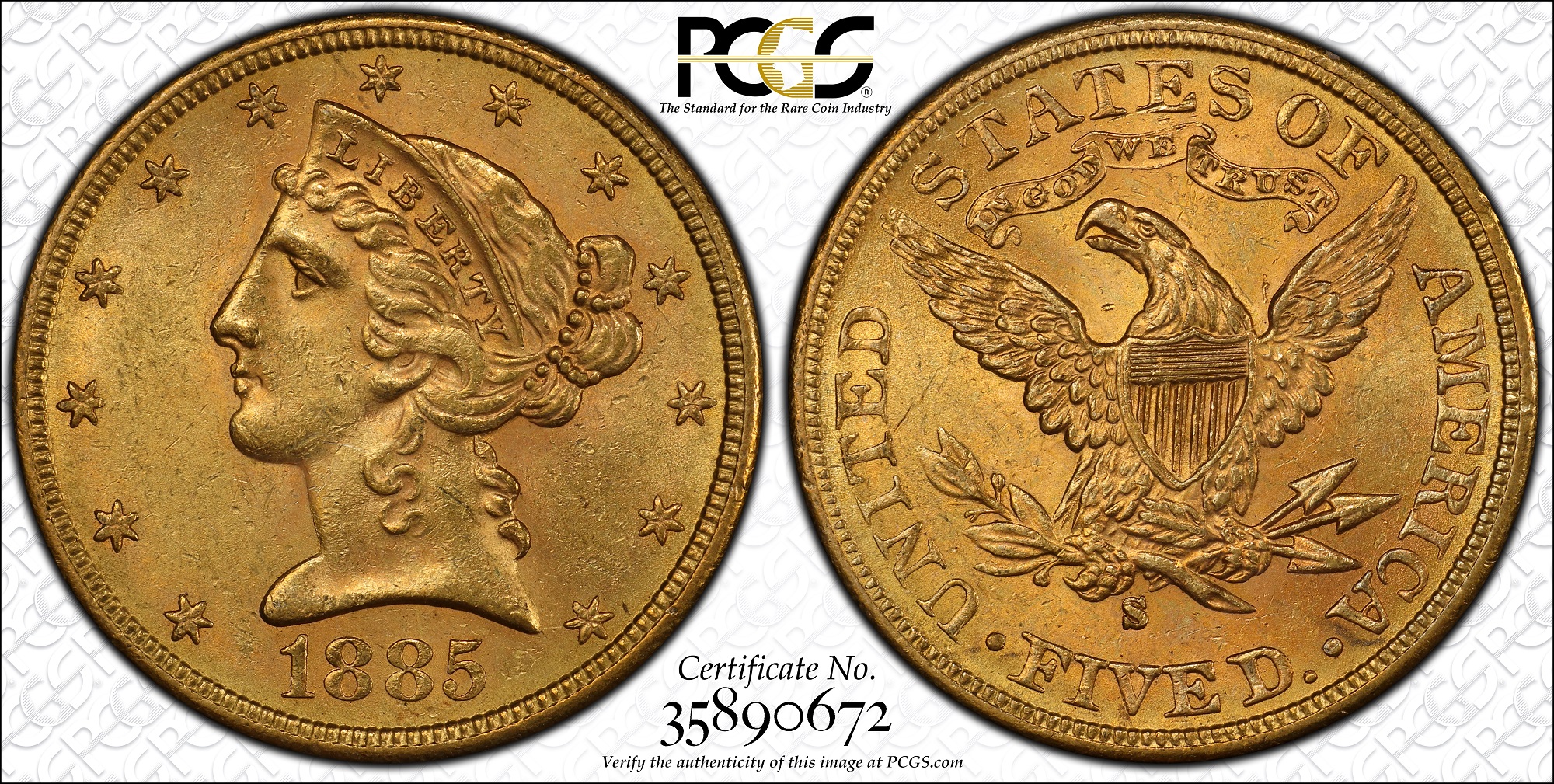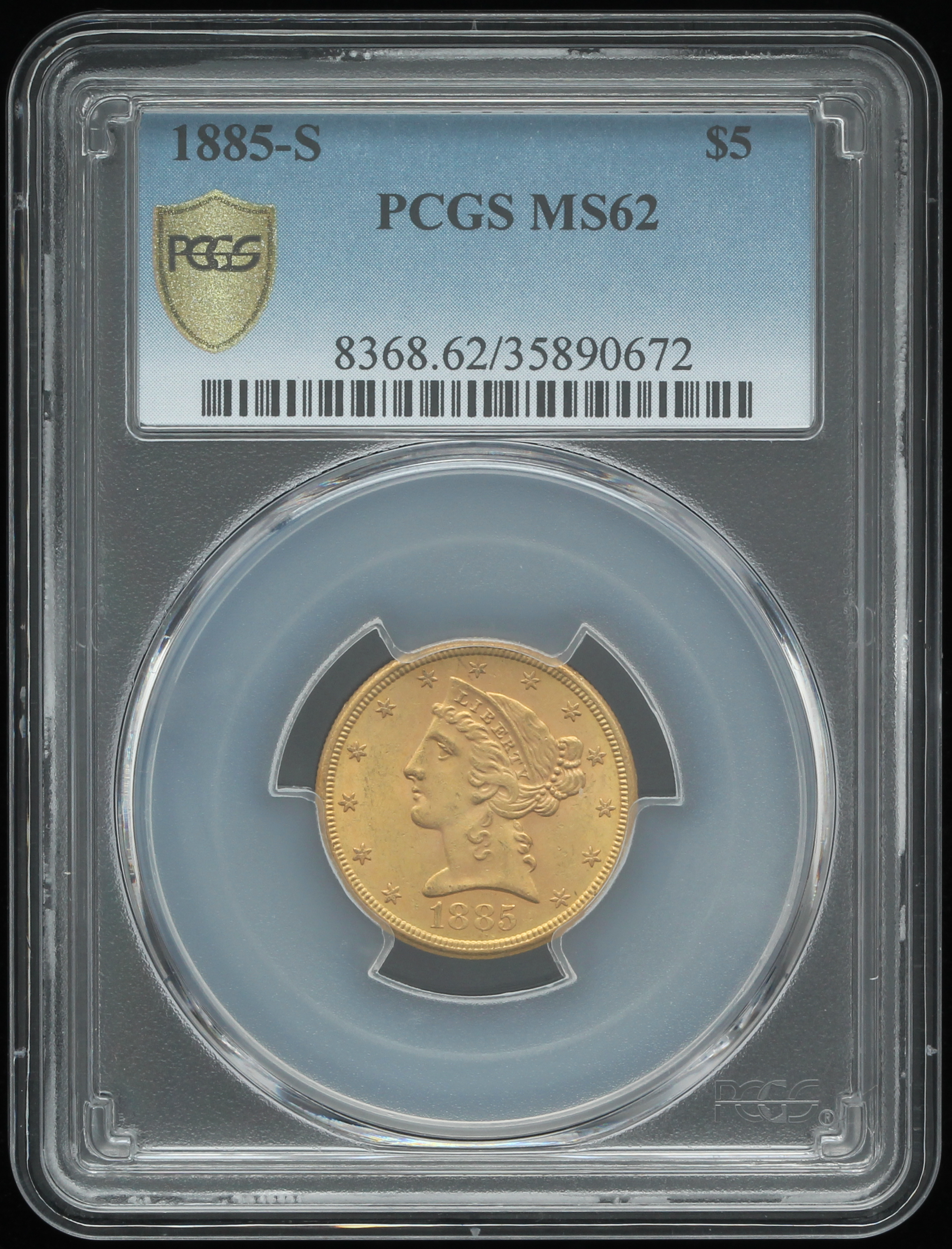 1885-S $5 Five Dollars Liberty Head Half Eagle Gold Coin (PCGS Gold Shield MS 62)