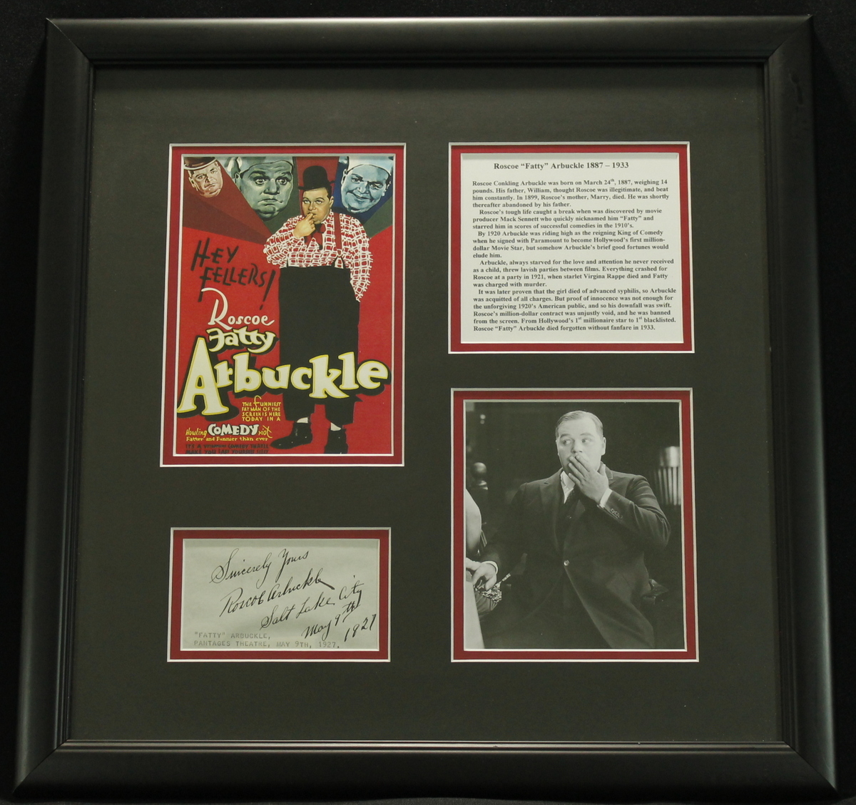 Roscoe "Fatty" Arbuckle Signed 17x18 Custom Framed Display Inscribed "Sincerely Yours" & "Salt Lake City" (PSA COA)