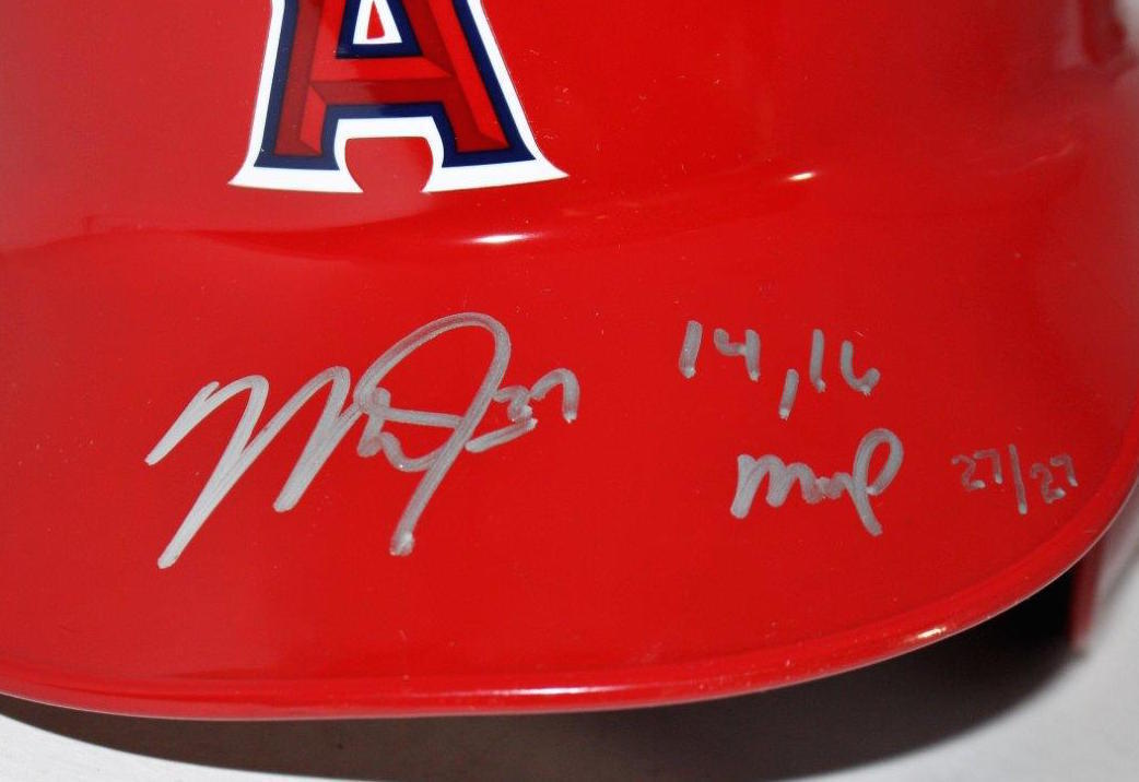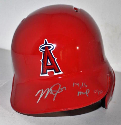 This Angels batting helmet has been hand signed and inscribed by Mike Trout. Trout added the inscription "14/16 MVP" to make this limited edition item a must have for any collector. The signature on this item has been authenticated by Major League Baseball and features a uniquely numbered tamper-proof hologram which can be verified in the Major League Baseball online database. This process ensures your item is authentic and prevents duplication and fraud. In addition, a Steiner Sports hologram and the certificate is included. This helmet is limited to only 27 and you will receive a random number from the edition. 100% Guaranteed Authentic Features Tamper-Evident Steiner Hologram. Perfect Collector's Item.