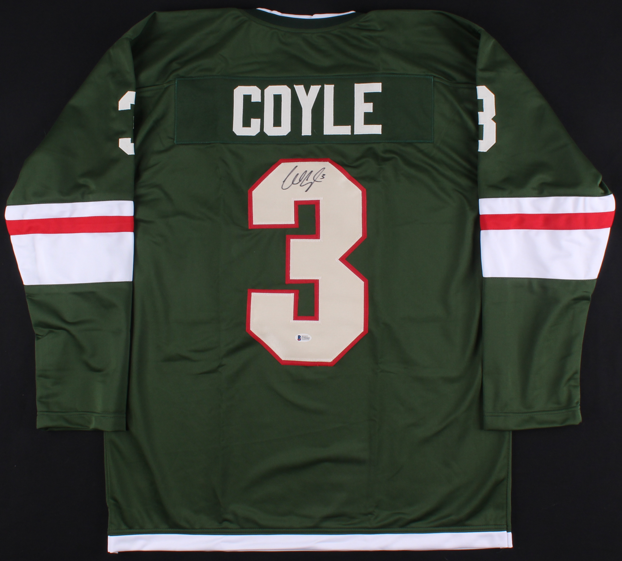 Custom on-ice style jersey. Everything is sewn on, size XL. Hand-signed in black felt-tip pen by Charlie Coyle.