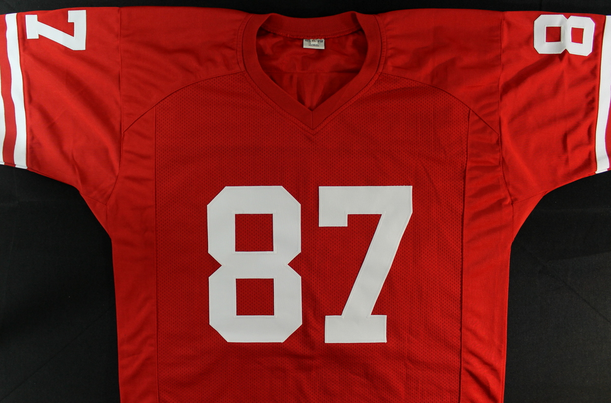Custom on-field style jersey. Everything is sewn on, size XL. Hand-signed and inscribed "The Catch" and "1-10-82" in black felt tip pen by Dwight Clark.