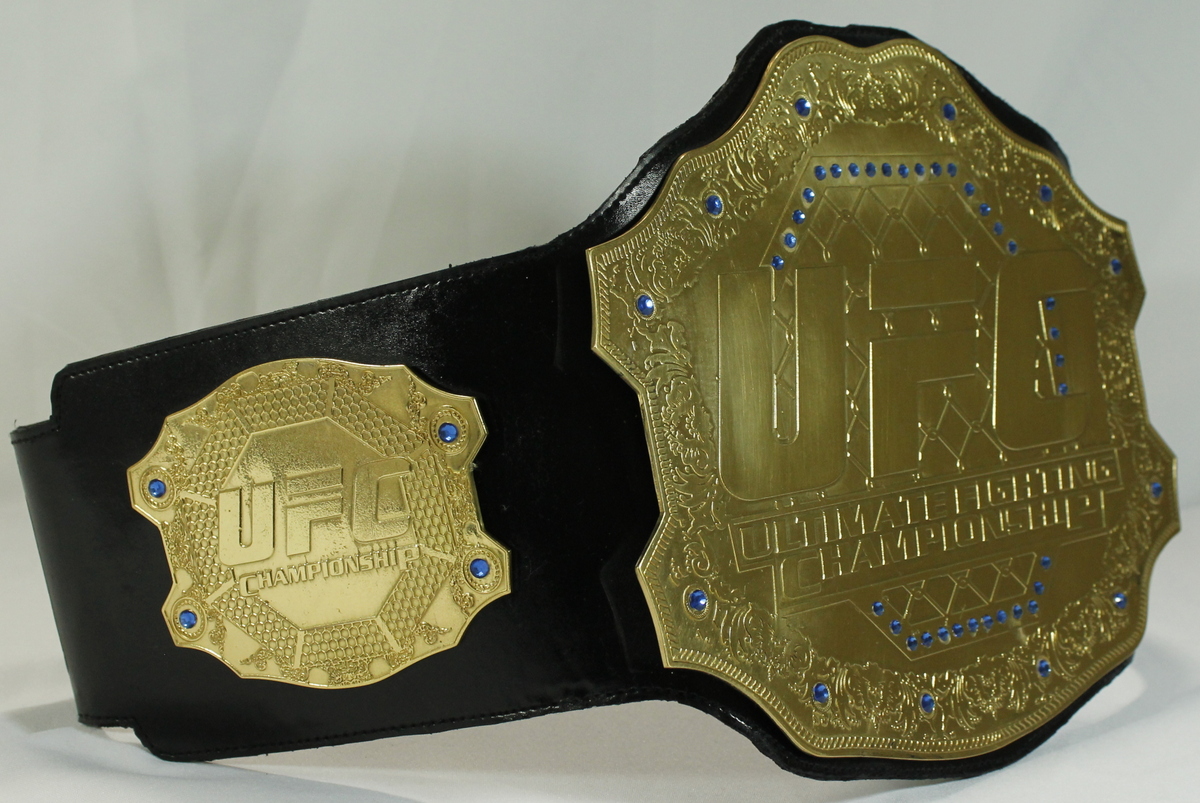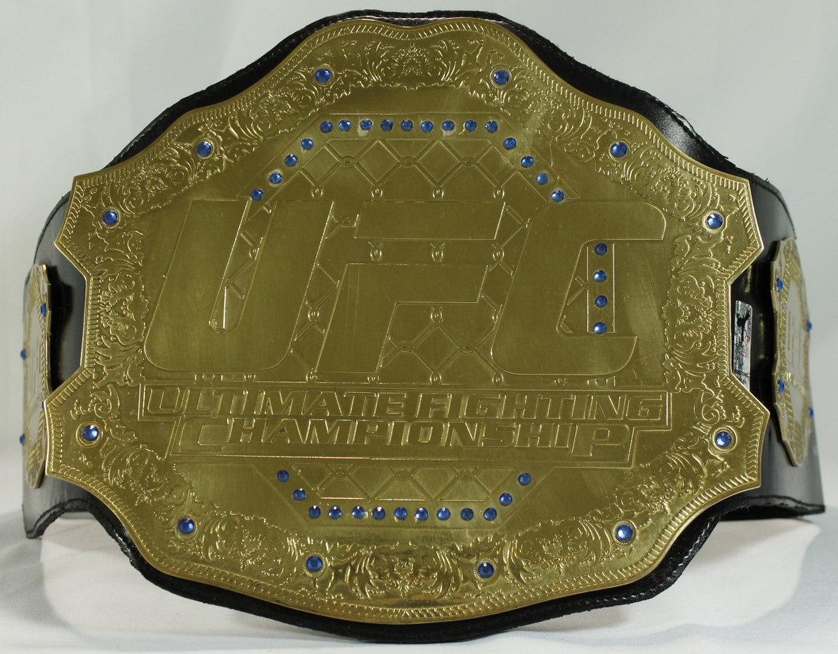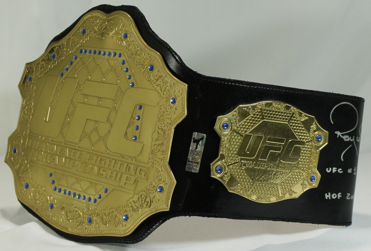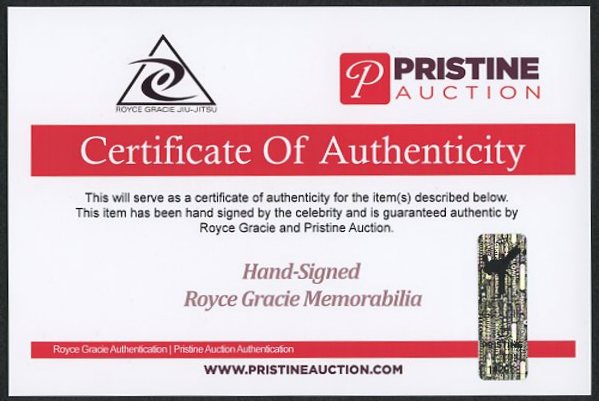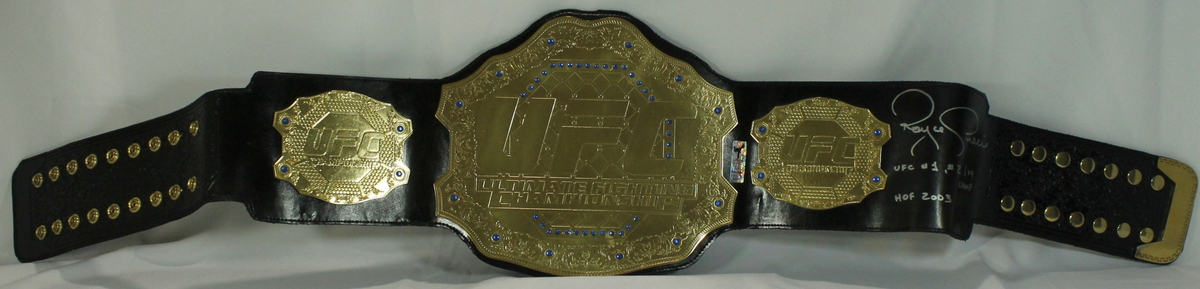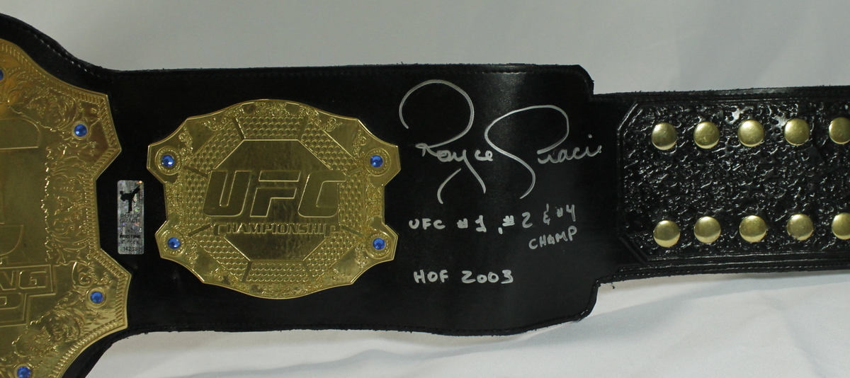 This authentic full-size UFC belt features gold plated plates along with an embossed artificial leather adjustable belt. The belt is hand-signed and inscribed "HOF 2003" and "UFC 1, 2 & 4 Champ" in silver paint pen by UFC legend, Royce Gracie. Autograph includes an official Royce Gracie hologram and matching COA from Pristine Auction for authenticity purposes. COA #14219.