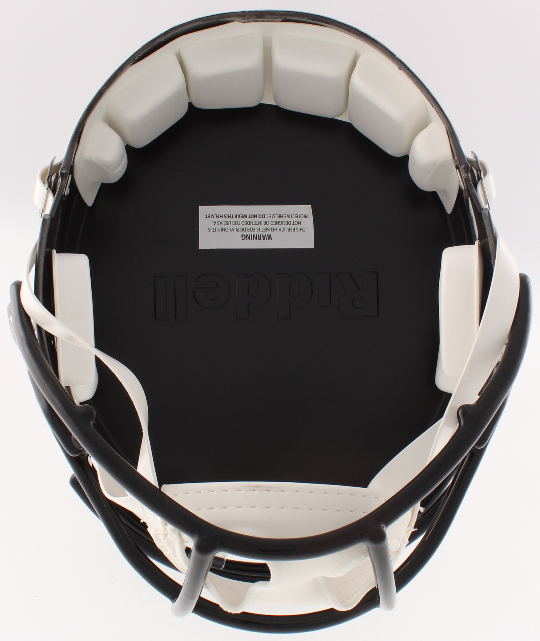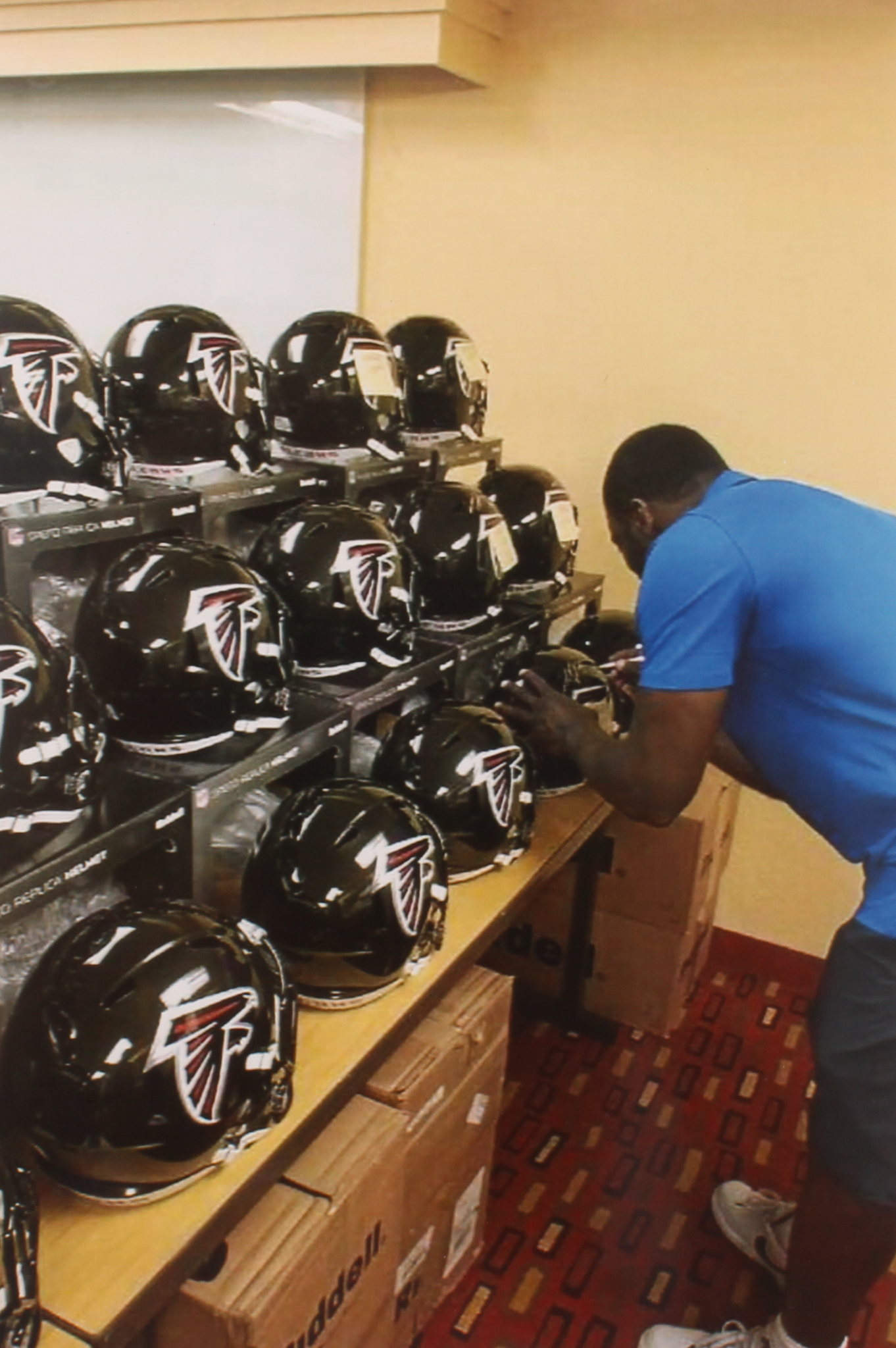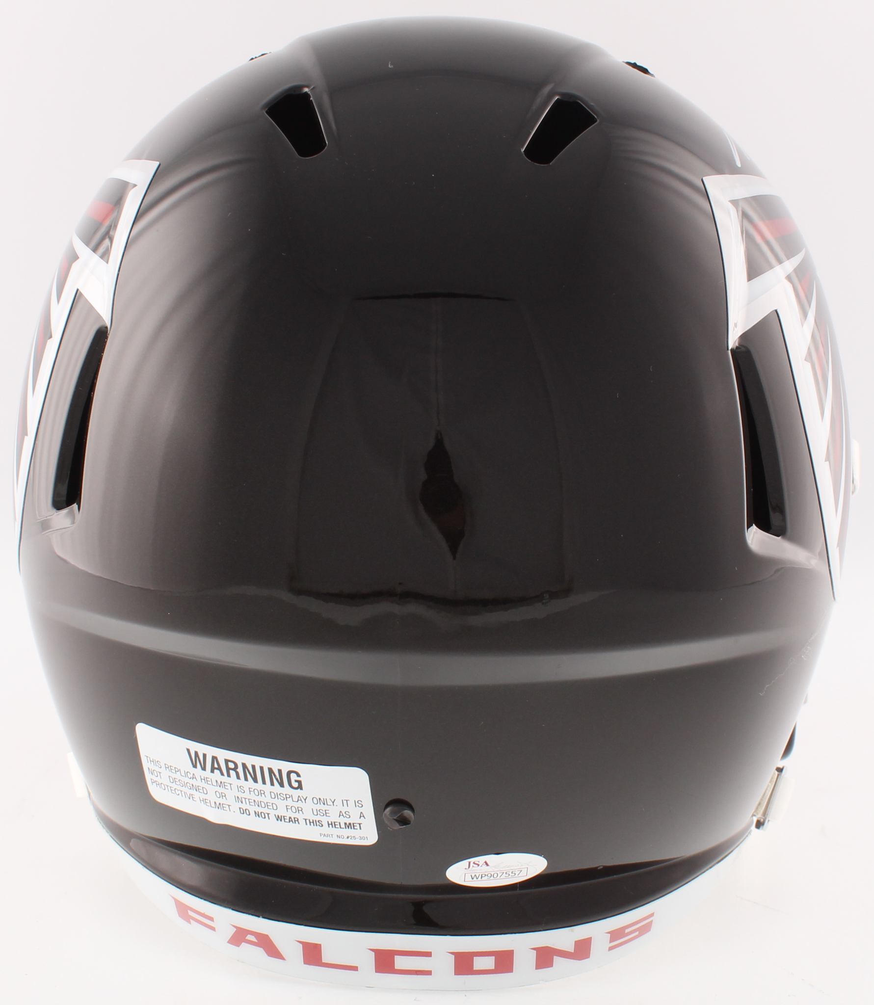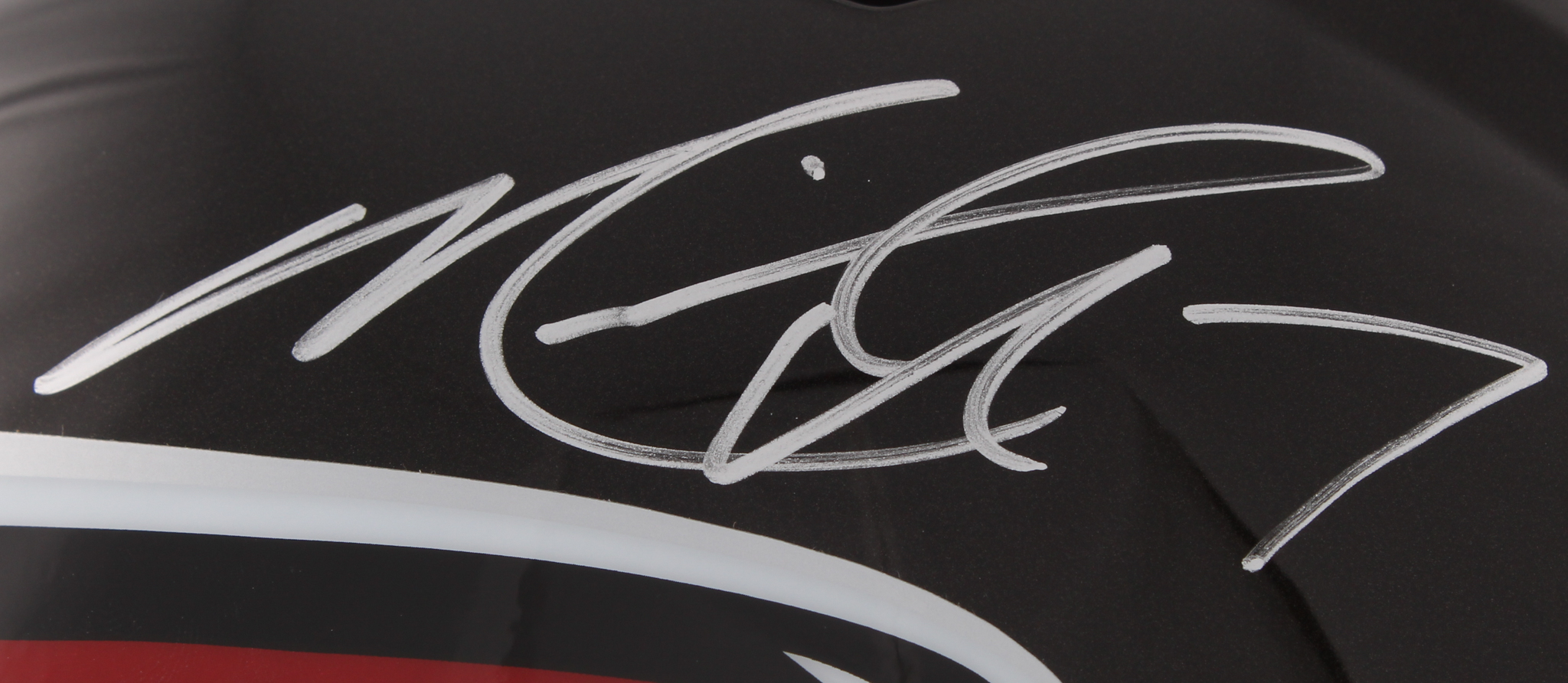 Replica Atlanta Falcons full-size speed helmet has been hand-signed and inscribed in sliver paint pen by Michael Vick.