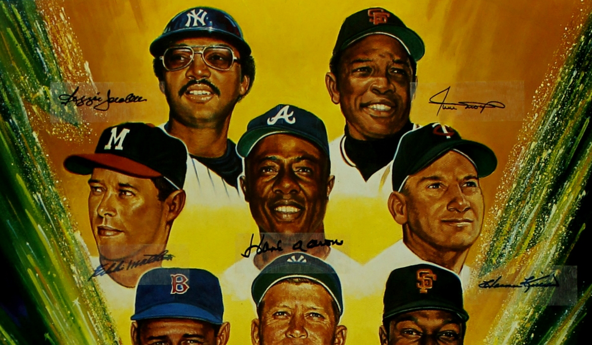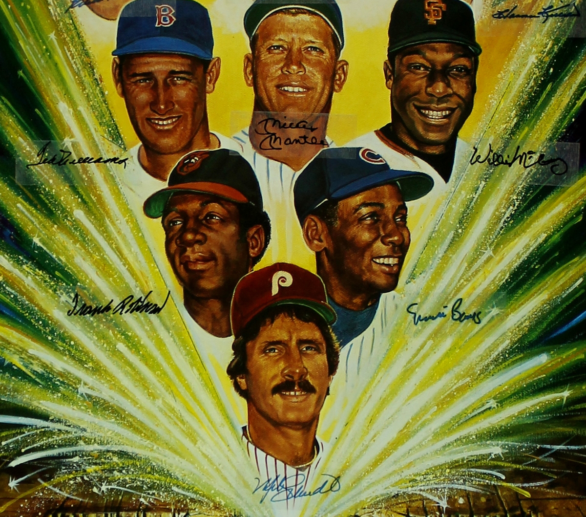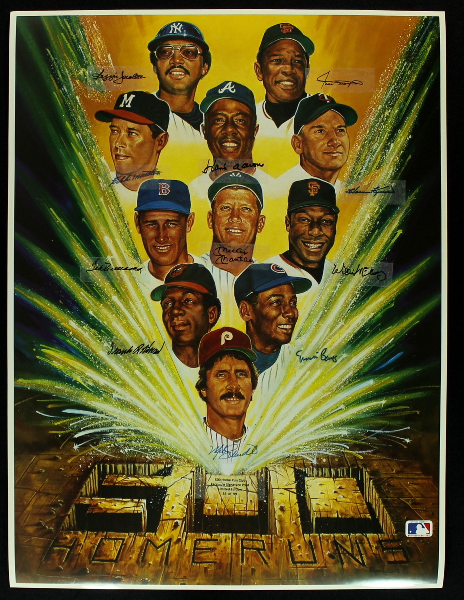 Lithograph measures 18" x 24" in size and features (11) MLB 500th Home Run Hitters including Mickey Mantle, Willie Mays, Hank Aaron, Ted Williams, Ernie Banks, Reggie Jackson and more. The piece features facsimile signatures from each of the (11) depicted 500 home run hitters. The signatures are facsimile, the lithograph is not hand-signed.