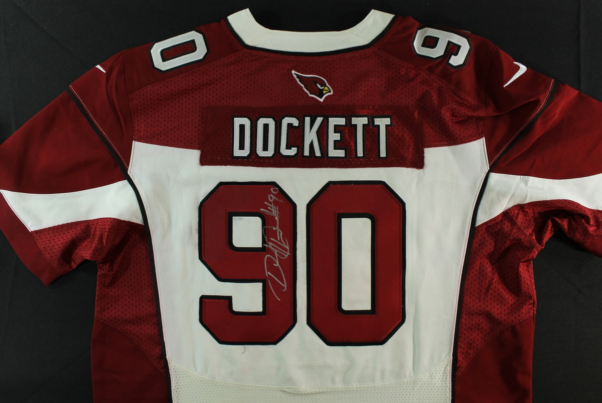 Nike on-field style jersey. Everything sewn on, size 52. Hand-signed in silver paint pen by Darnell Dockett. Autograph includes an authenticity guarantee and LOA from Pristine Auction.