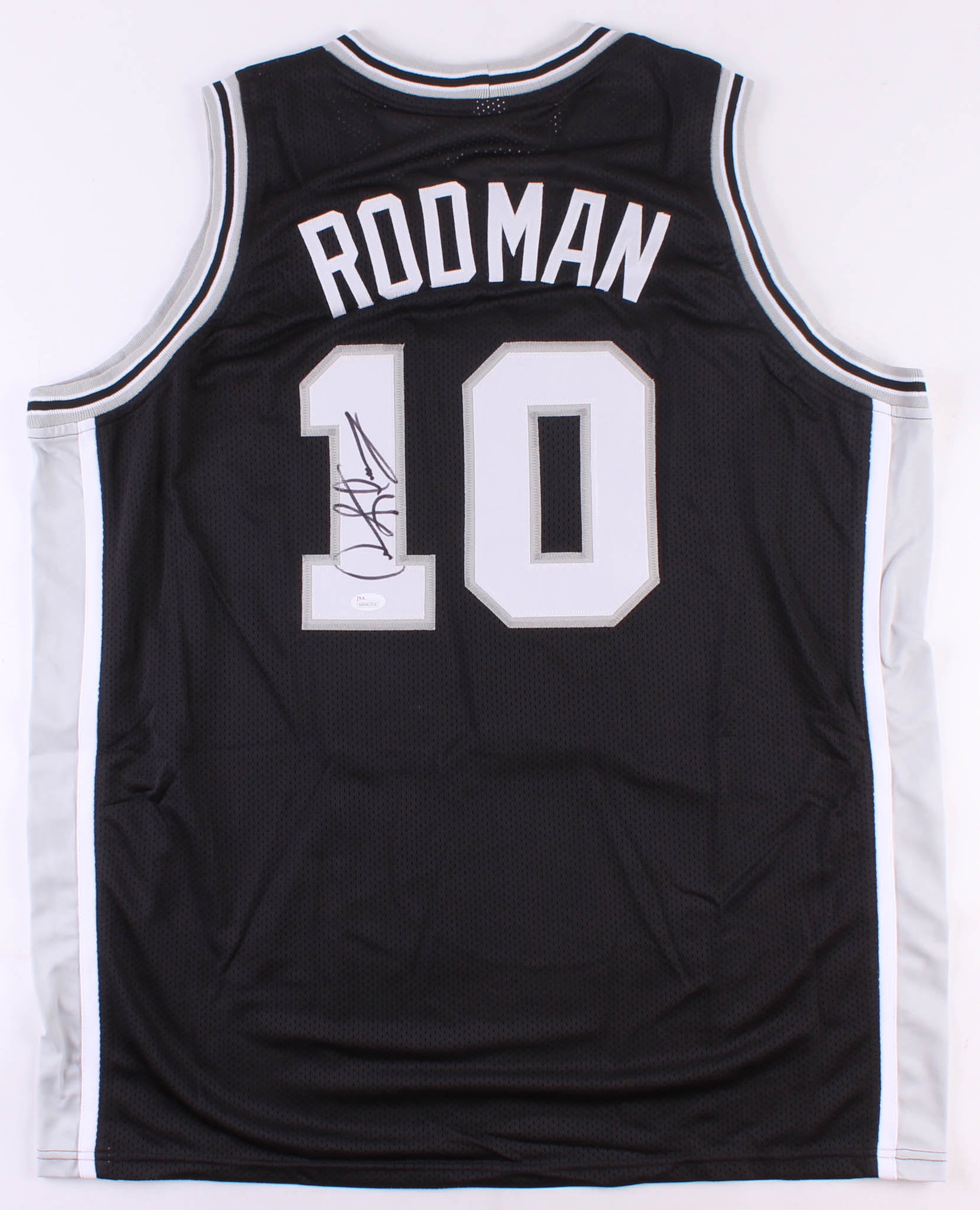Custom on-court style jersey. Everything sewn on, size XL. Hand-signed in black felt-tip pen by Dennis Rodman (HOF).