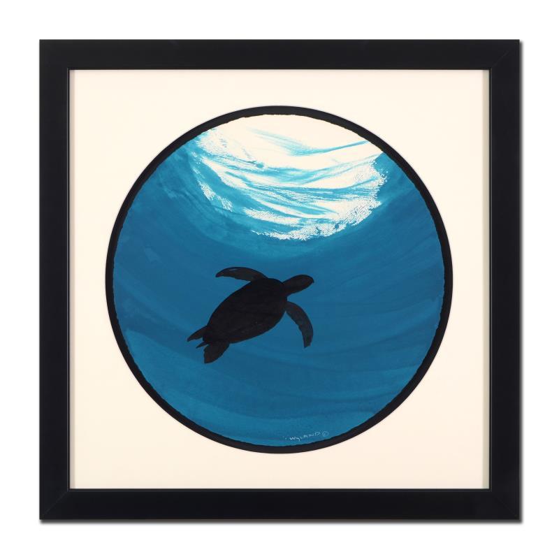 "Turtle" is an original watercolor painting on round cut deckle edge paper by Wyland, hand signed by the artist. This piece is custom framed. Includes Certificate of Authenticity. Measures approx. 28.5" x 28.5" (frame), 19" (image diameter).