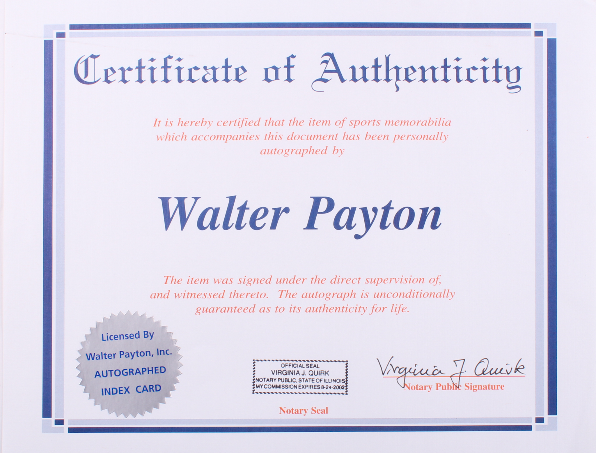 The autograph includes an official Walter Payton hologram and matching COA from Celebrity Appearances, Inc for authenticity purposes.