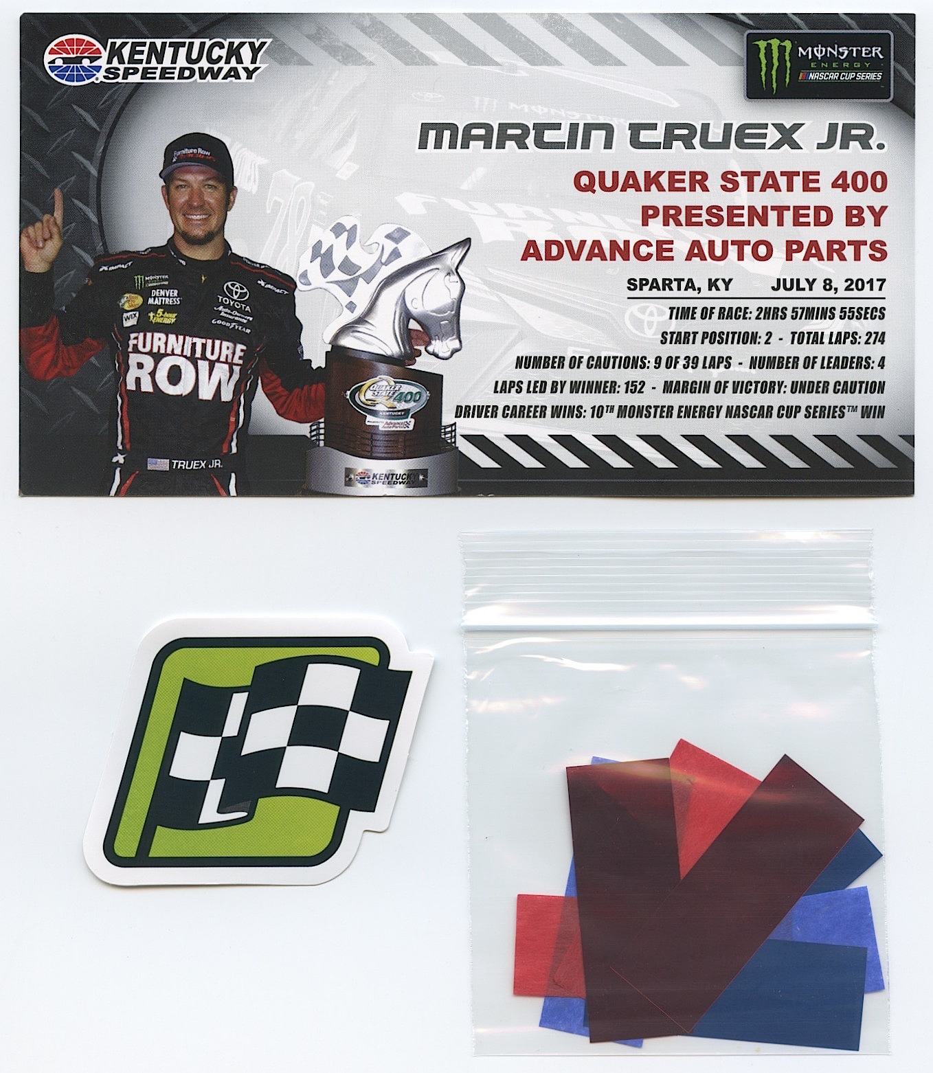 This rare win car also includes a collector card along with a win sticker (actual size) and replica confetti.