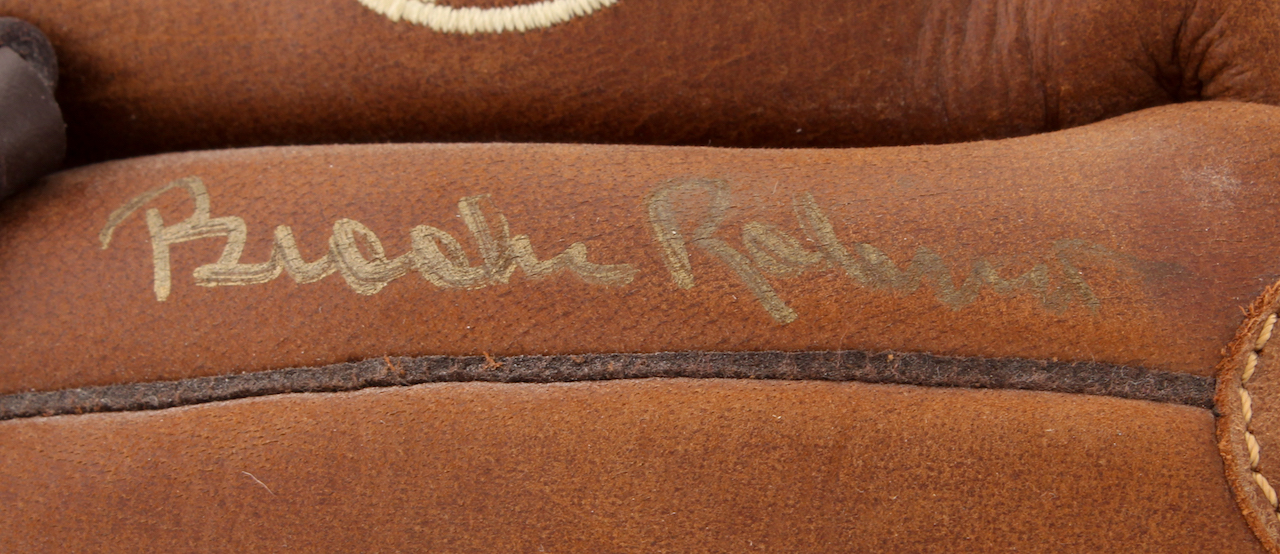 Rawlings "The Gold Glove Co." baseball glove. Hand-signed in gold paint pen by Brooks Robinson (Orioles, HOF).