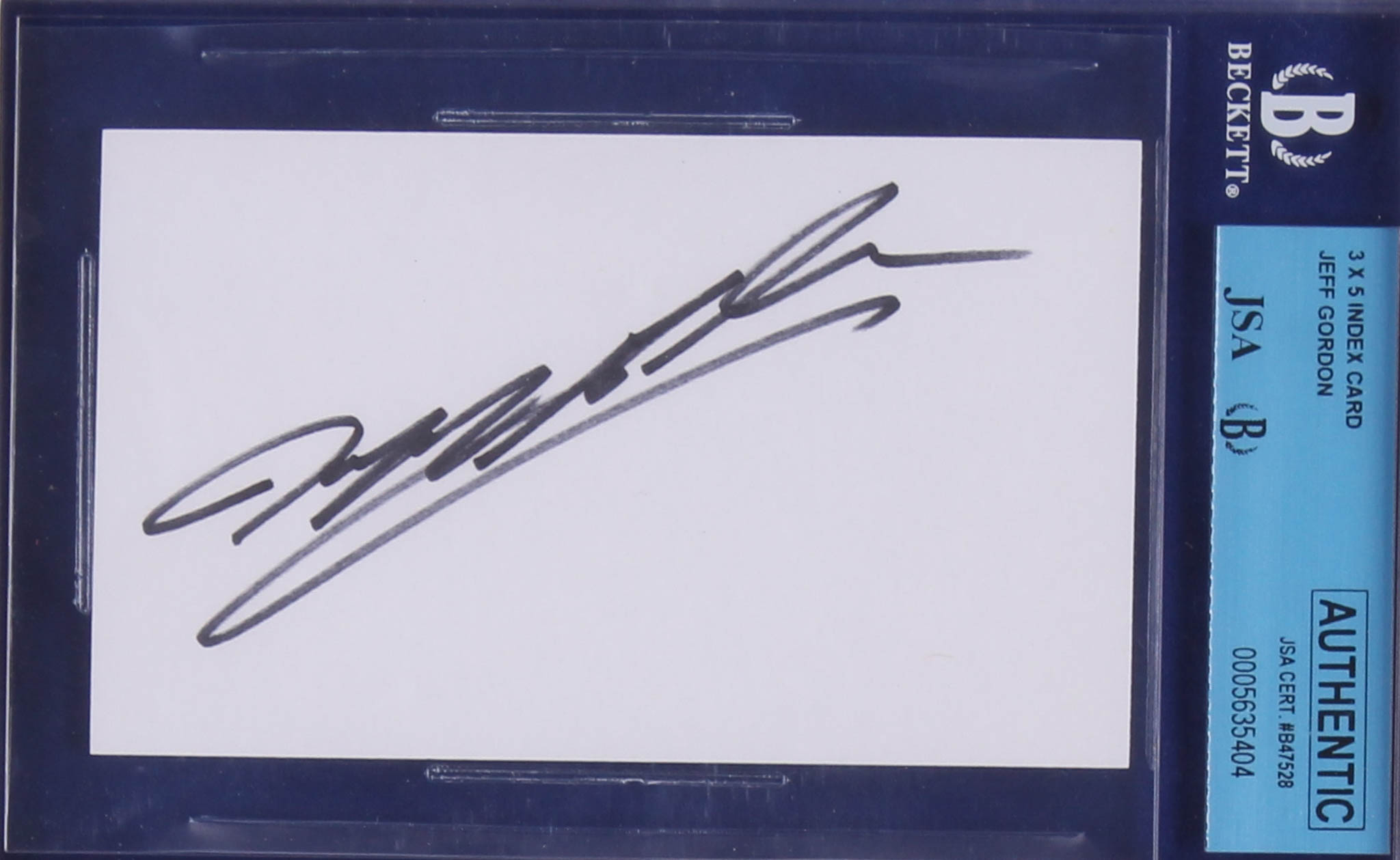 Custom framed index card display measures 25.25" x 27.25" in size and features an index card that has been hand-signed in black felt-tip pen by Jeff Gordon (HOF).