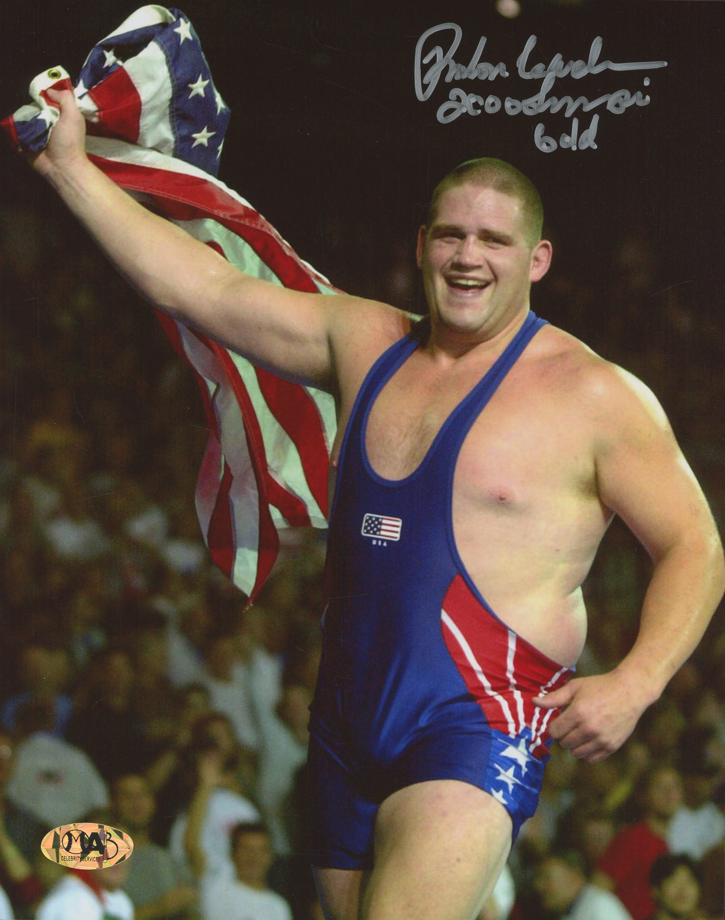 Photo measures 8" x 10" in size. Hand-signed in silver paint pen by Rulon Gardner (HOF).
