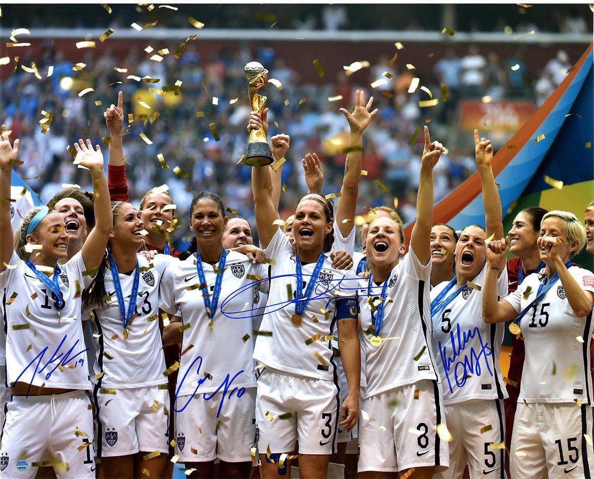 Photo measures 16" x 20" in size and has been hand-signed in blue felt-tip pen by Christie Rampone, Kelly O'Hara, Julie Johnston, and Carli Lloyd.