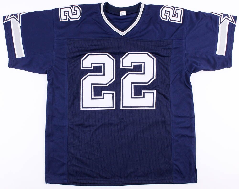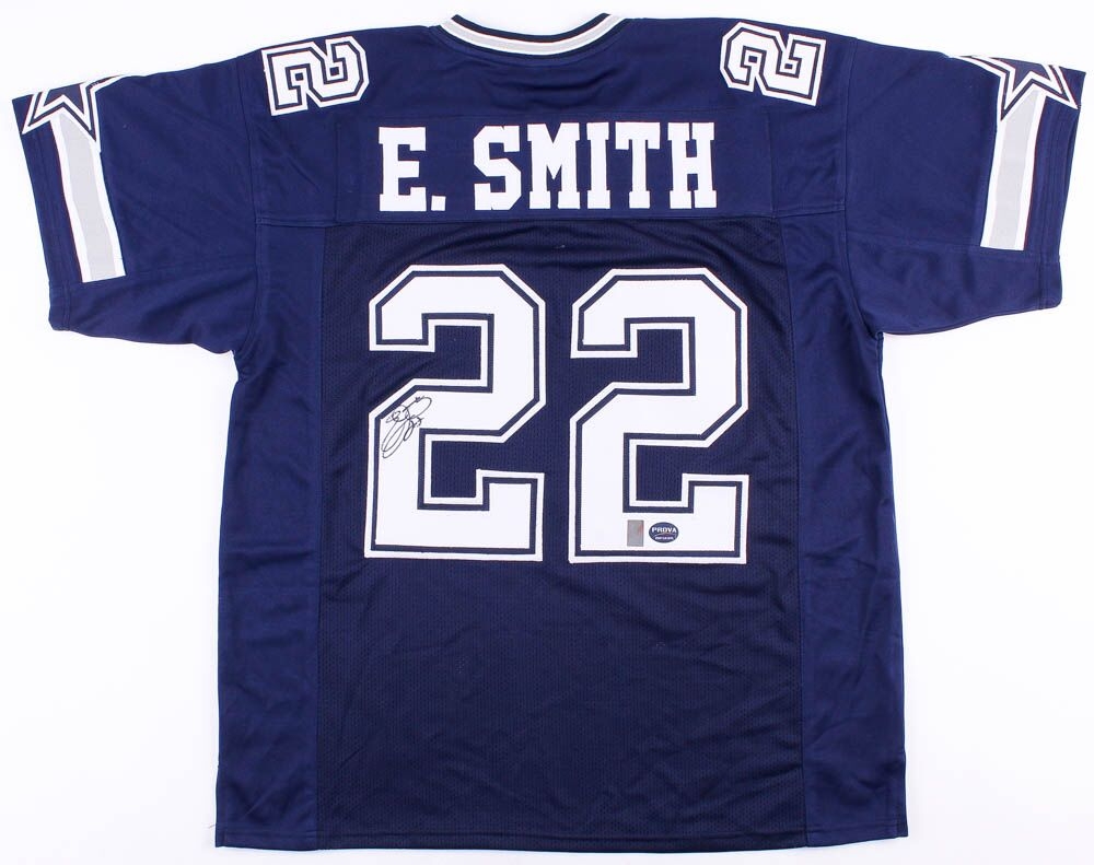 Custom on-field style jersey. Everything is sewn on, size XL. Hand-signed in black felt tip pen by Emmitt Smith (HOF).