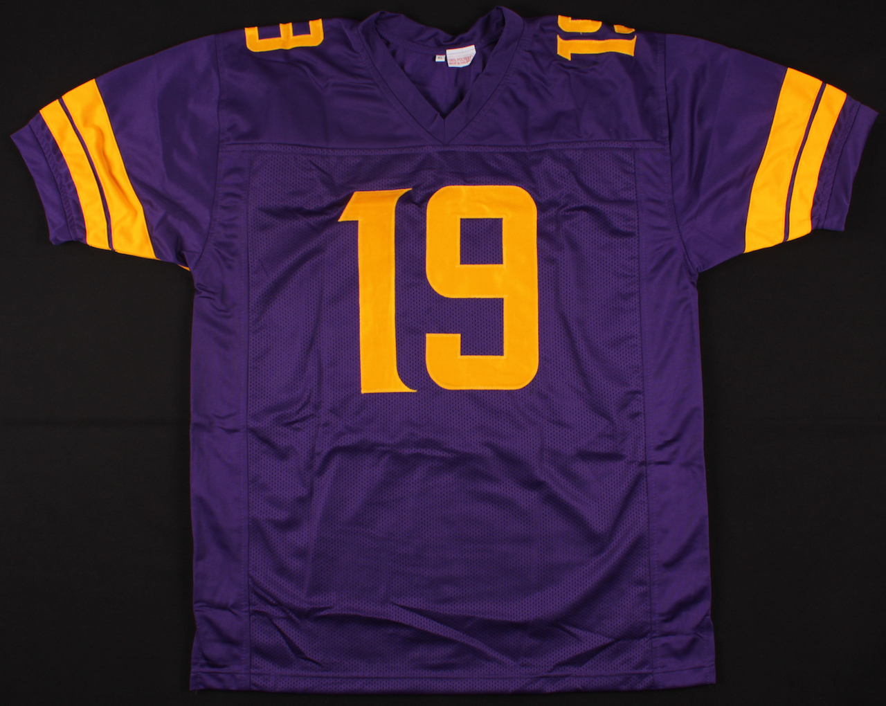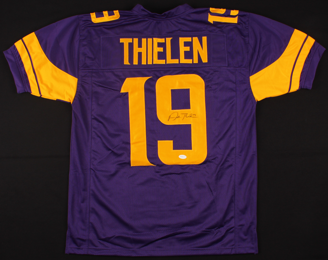 Custom on-field style color rush jersey. Everything is sewn on, size XL. Hand-signed in black felt-tip pen by Adam Thielen.