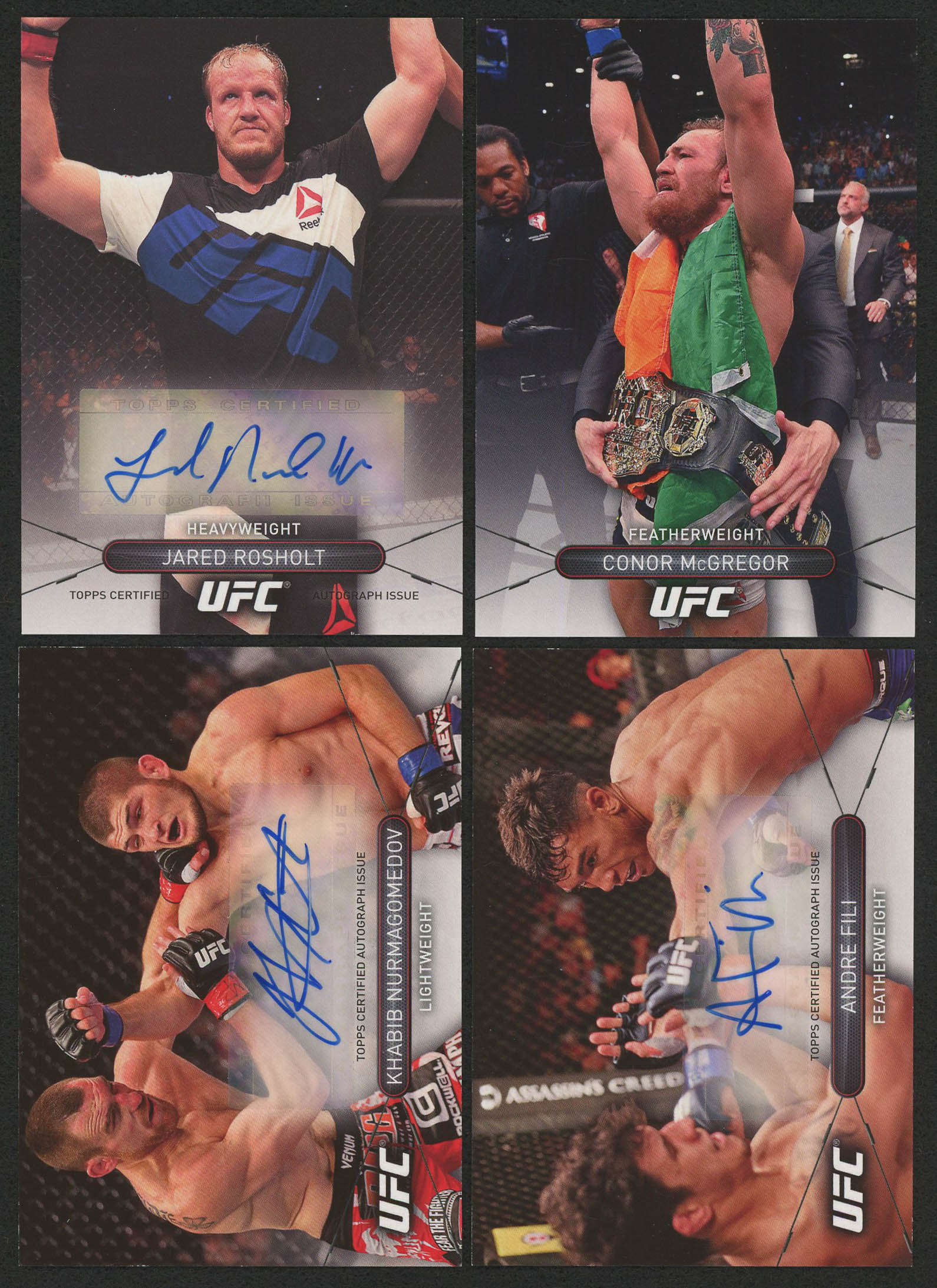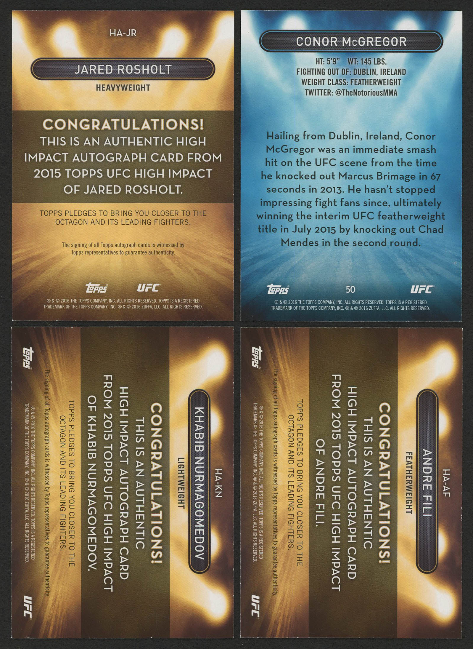 Lot of (4) 2016 Topps UFC High Impact Cards with Autographs #HAJR Jared Rosholt, Blue #50 Conor McGregor, Autographs #HAAF Andre Fili, Autographs #HAKN Khabib Nurmagomedov