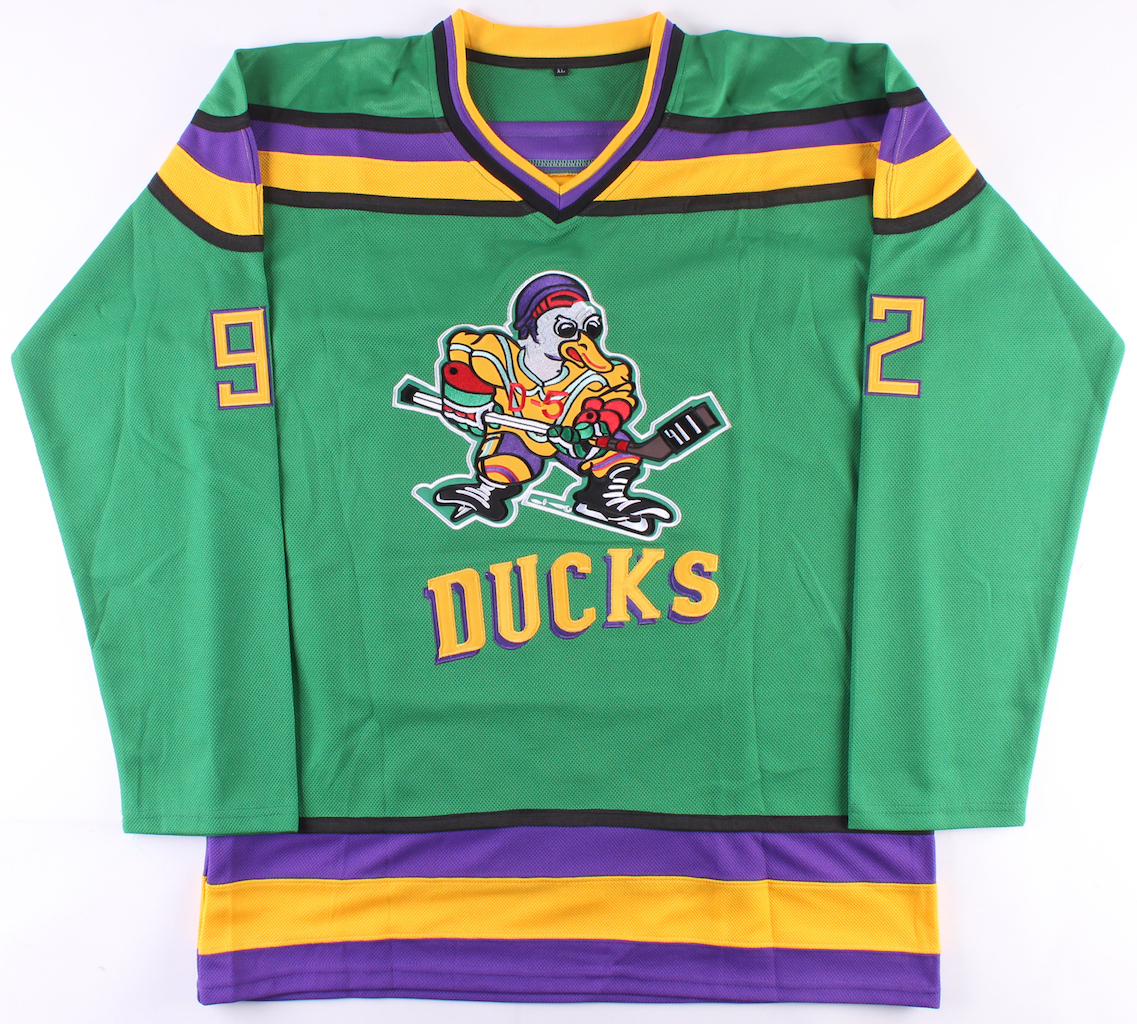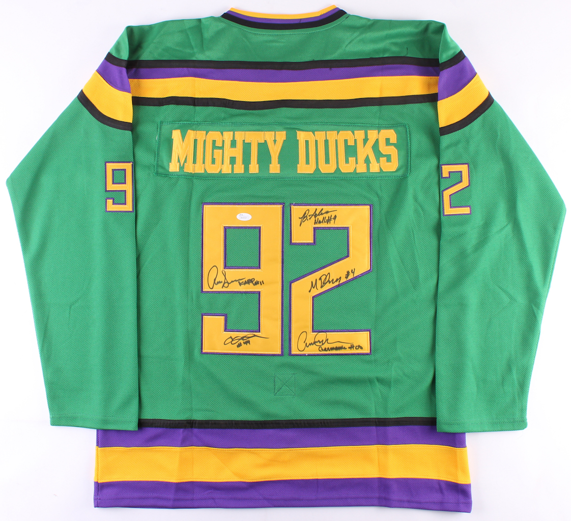 Custom on-ice style jersey. Everything is sewn on, size 2XL. Hand-signed in black felt-tip pen by (5) including Elden Henson (Fulton Reed), Matt Doherty (Les Averman), Brandon Adams (Jesse Hall), Garette Ratliff Henson (Guy Germaine), and Aaron Schwartz (Dave Karp).