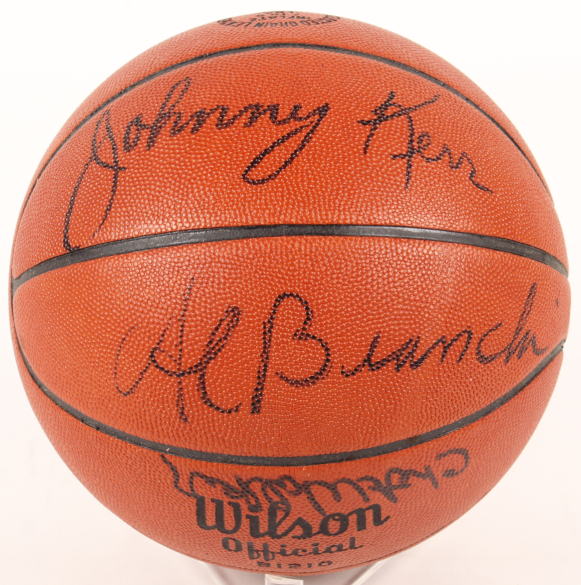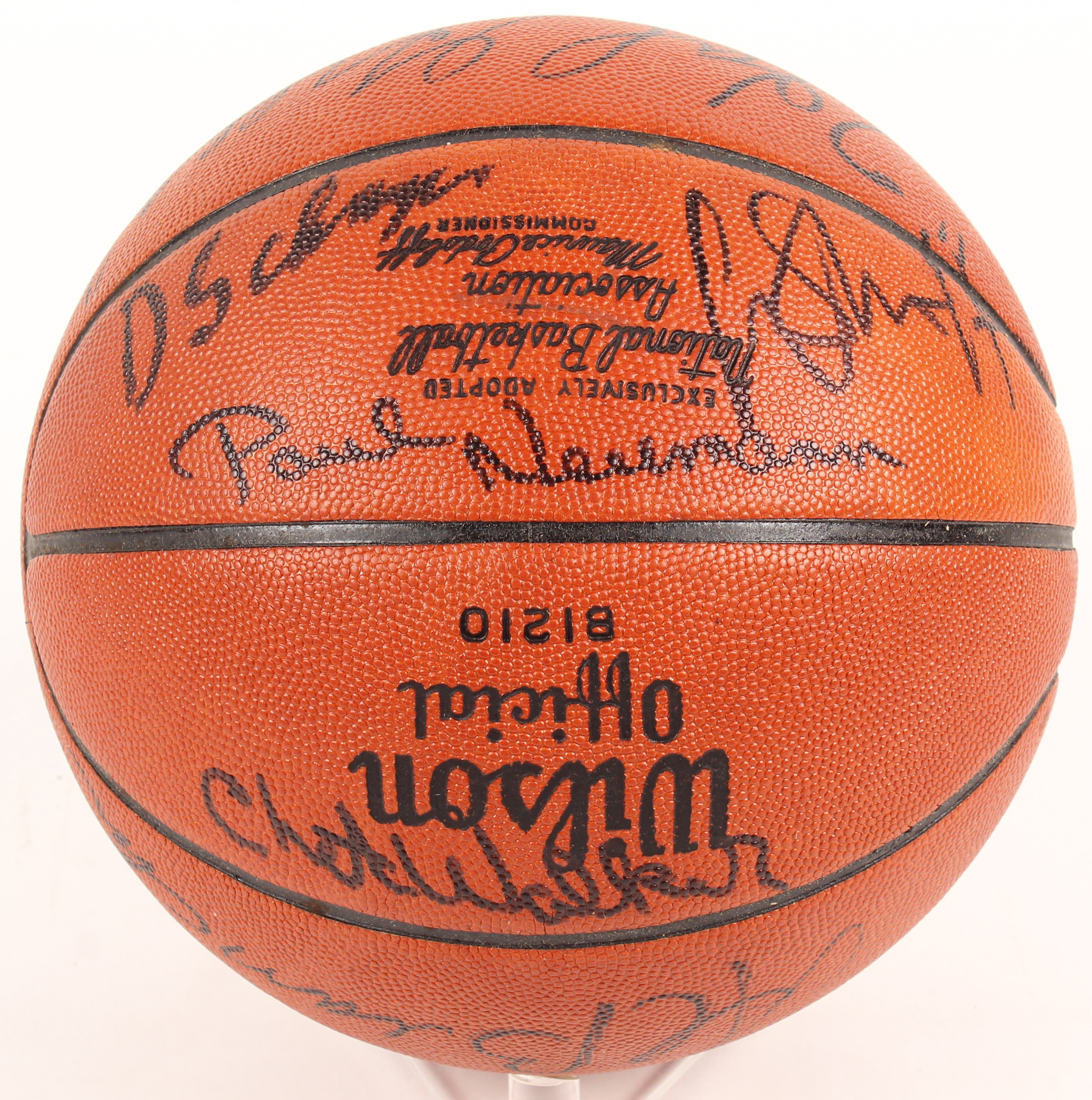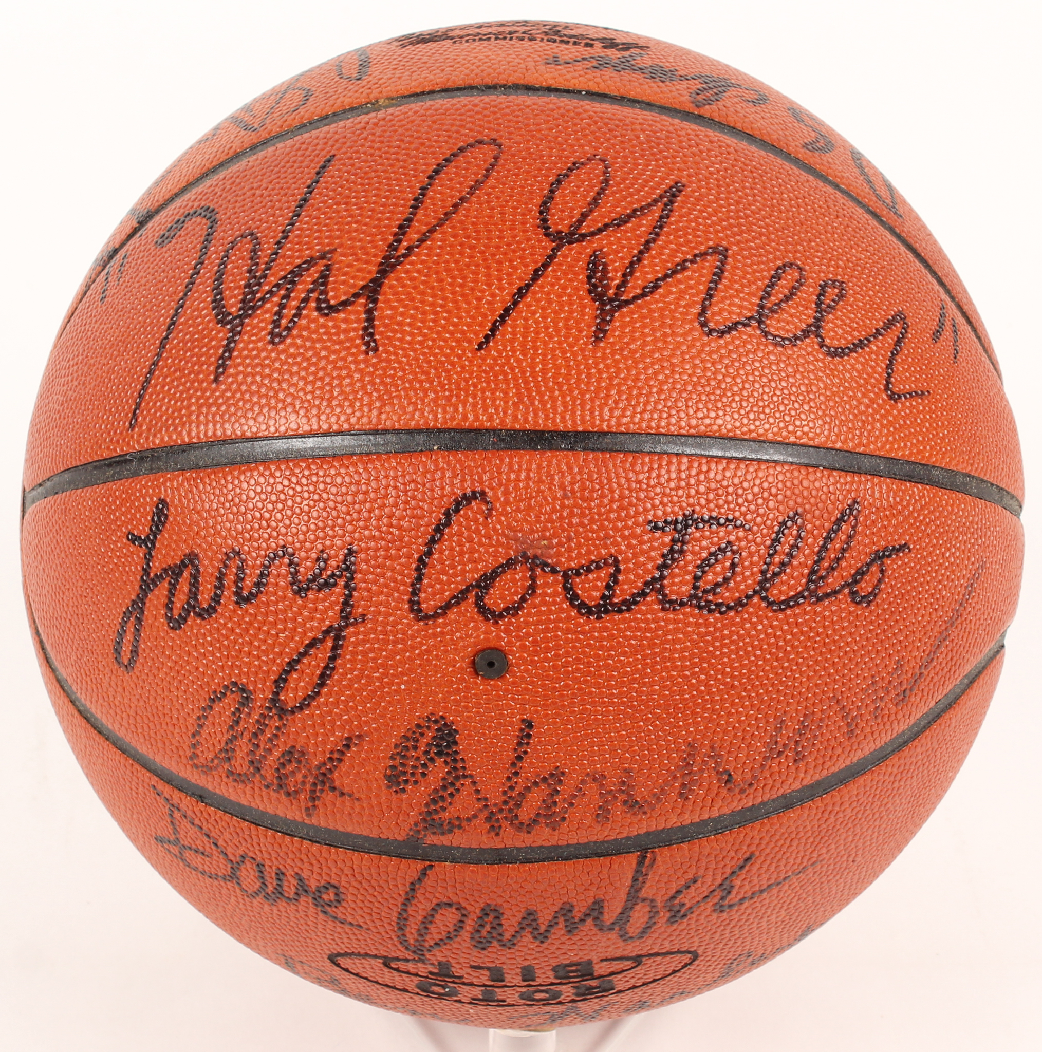 Unique and historical Wilson NBA Basketball has been team-signed in black felt-tip pen by (11) including Johnny Kerr, Hal Greer (HOF), Larry Costello, Chet Walker (HOF), Dave Gambee, Al Bianchi, Ben Warley, Paul Neumann, Dolph Schayes (HOF) Lee Shaffer, and Alex Hannum (Coach, HOF). (1962/63 Syracuse Nationals last season)