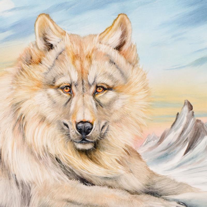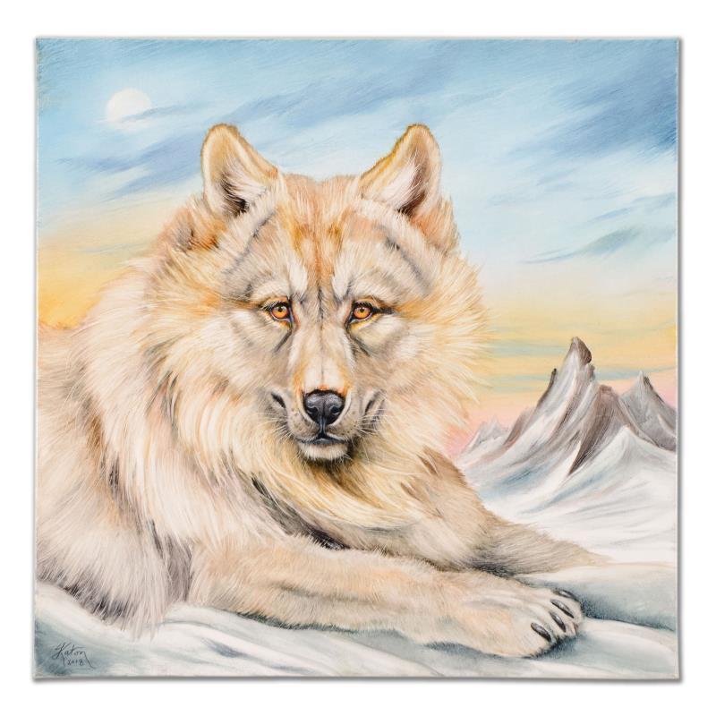 "White Mountain Wolf" is an original oil painting on stretched canvas by Martin Katon, hand signed by the artist. Includes Certificate of Authenticity. Measures approx. 24" x 24" (image).