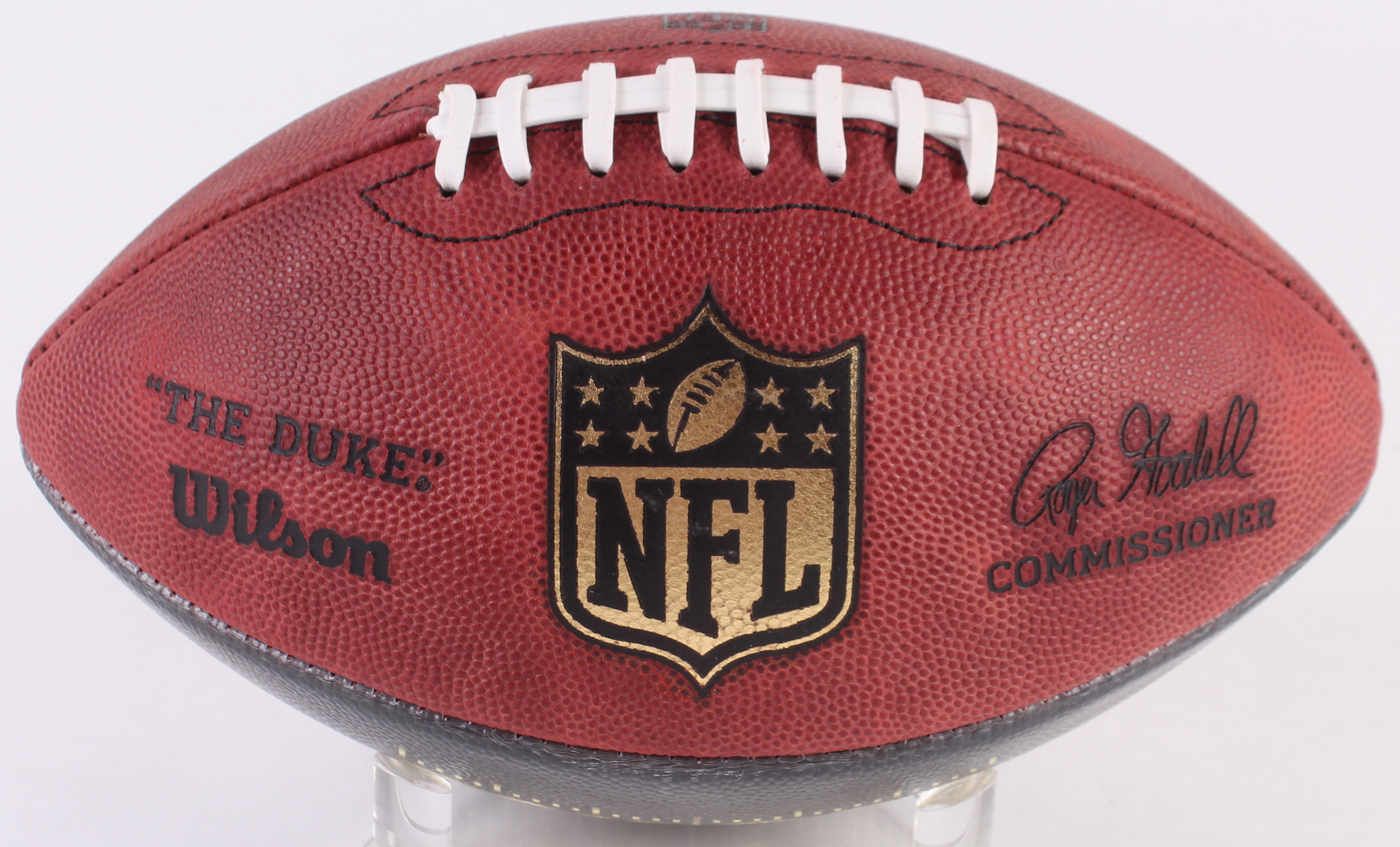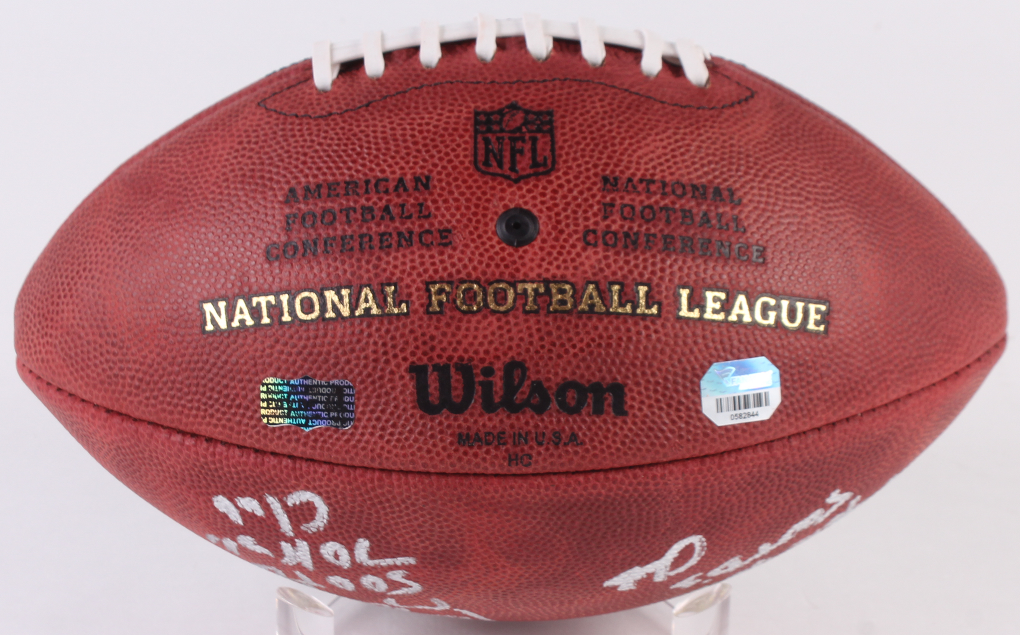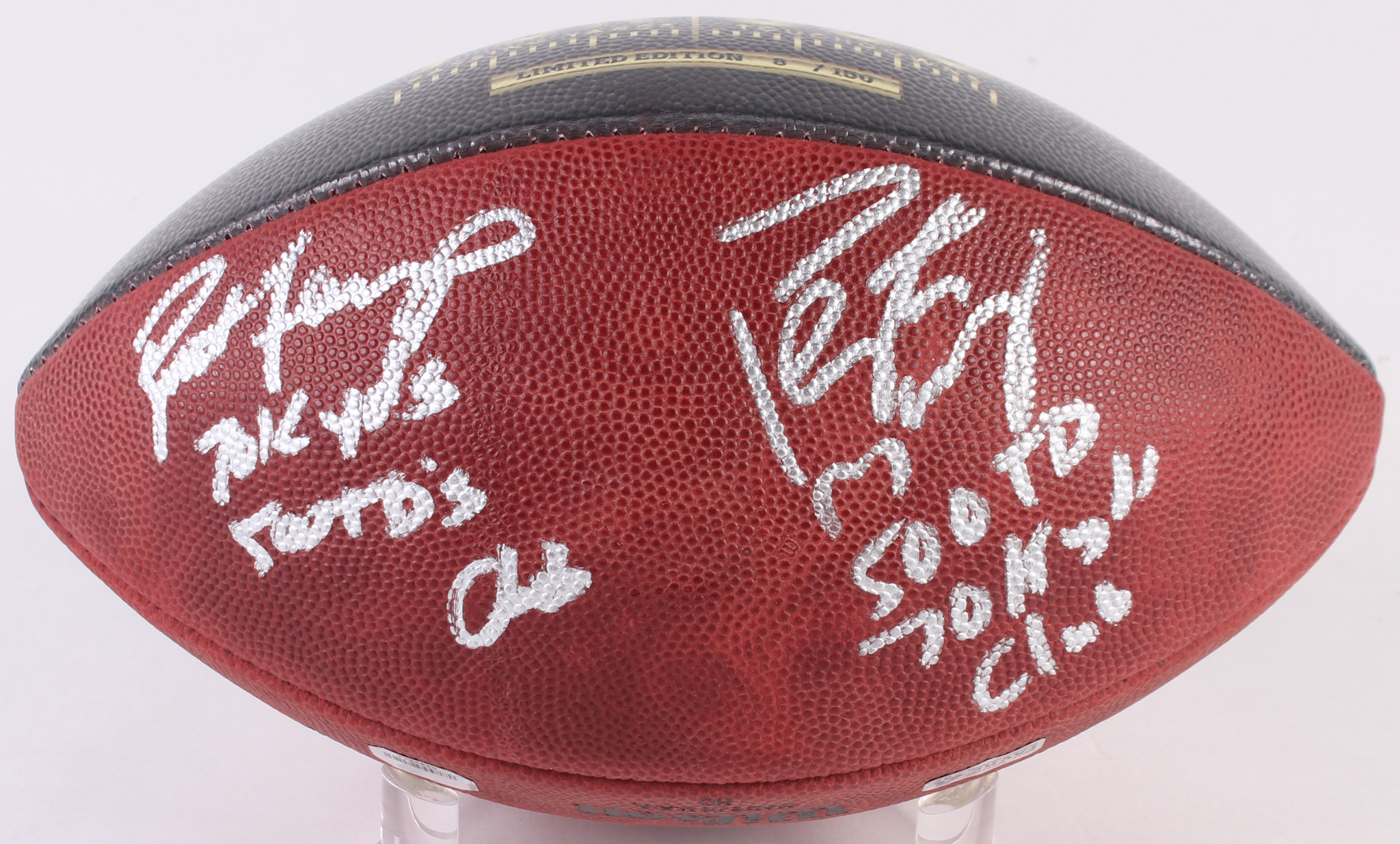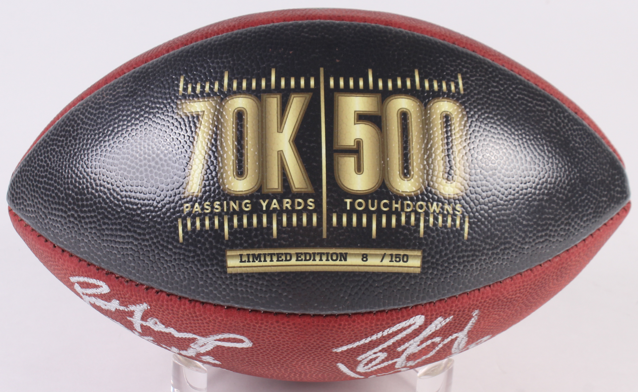 Wilson "70K Passing Yards & 500 Passing Touchdowns Club" official game football. Hand-signed and inscribed in silver paint pen by two of the NFL's most iconic quarterbacks, Brett Favre (Packers, HOF) and Peyton Manning (Colts, Broncos). Football is limited edition # out of 150.