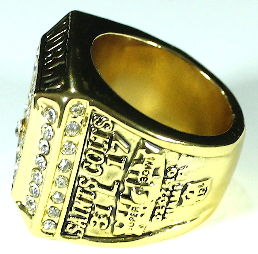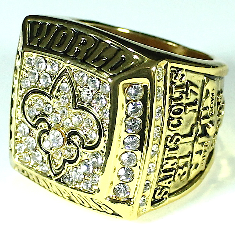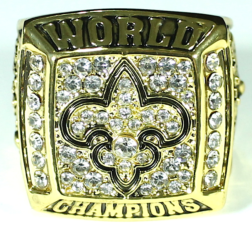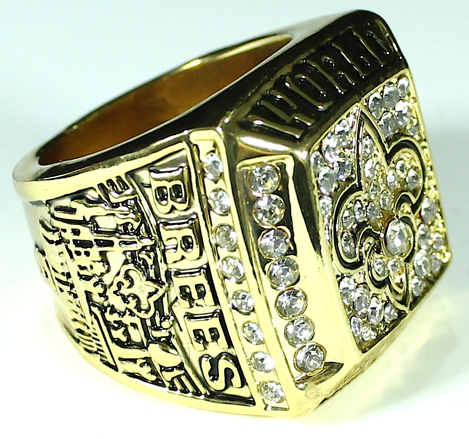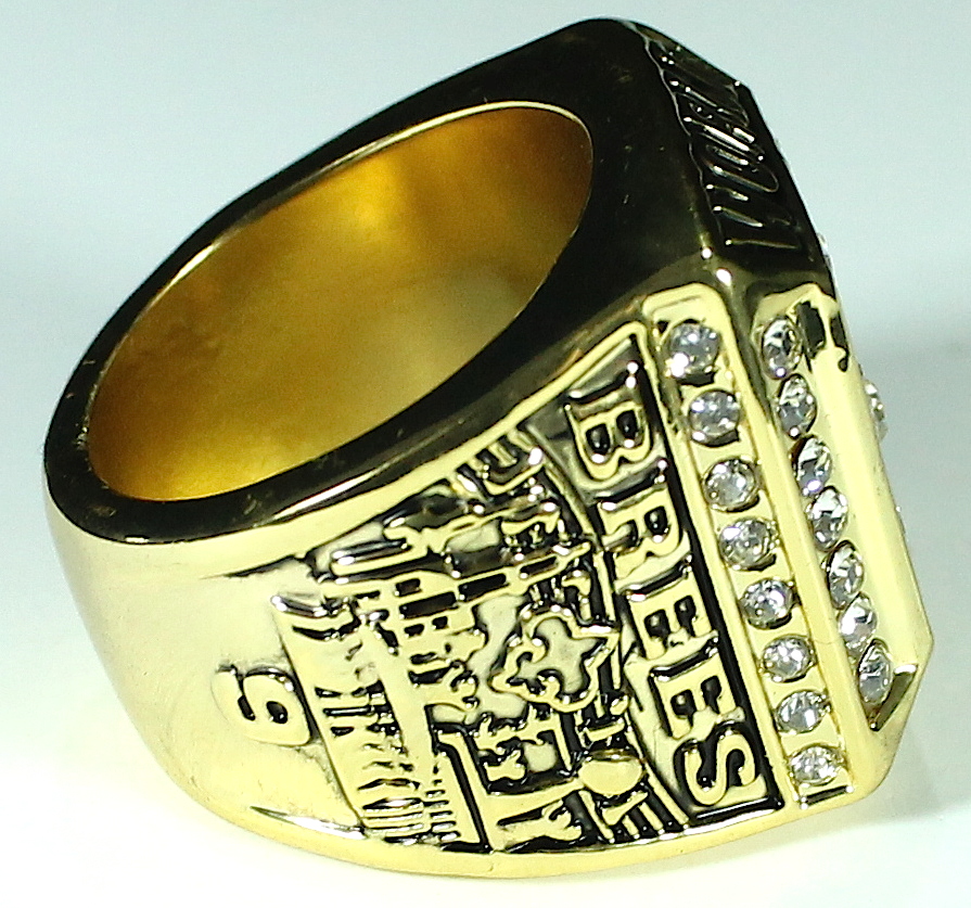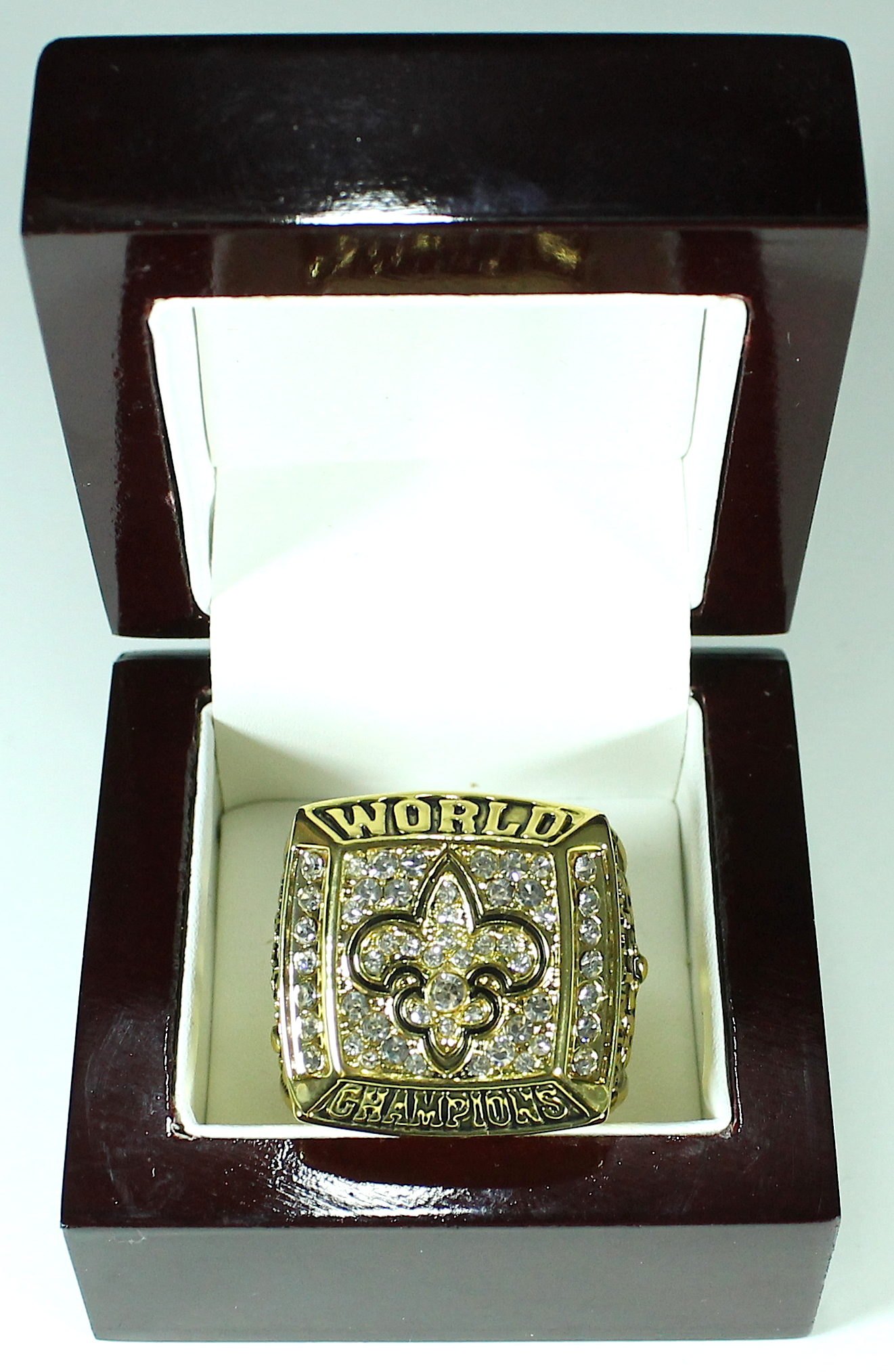 Drew Brees Saints High Quality Replica 2009 Super Bowl XLIV Championship Ring with cherry wood display case box. The ring has been hand crafted by professional jewelers. Made of metal alloy and clad with 18K Gold. Size 12.
