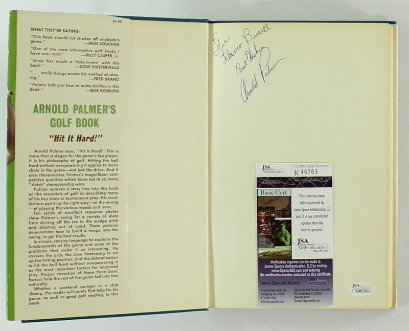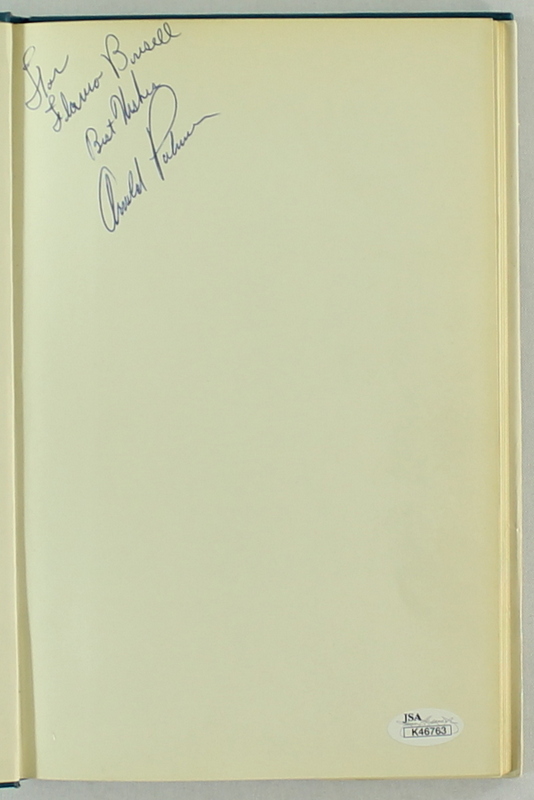 Hardcover book has been hand-signed in blue ink pen by Arnold Palmer. The autograph has been personalized. The autograph includes an official James Spence Authentication (JSA) hologram and matching COA for authenticity purposes.