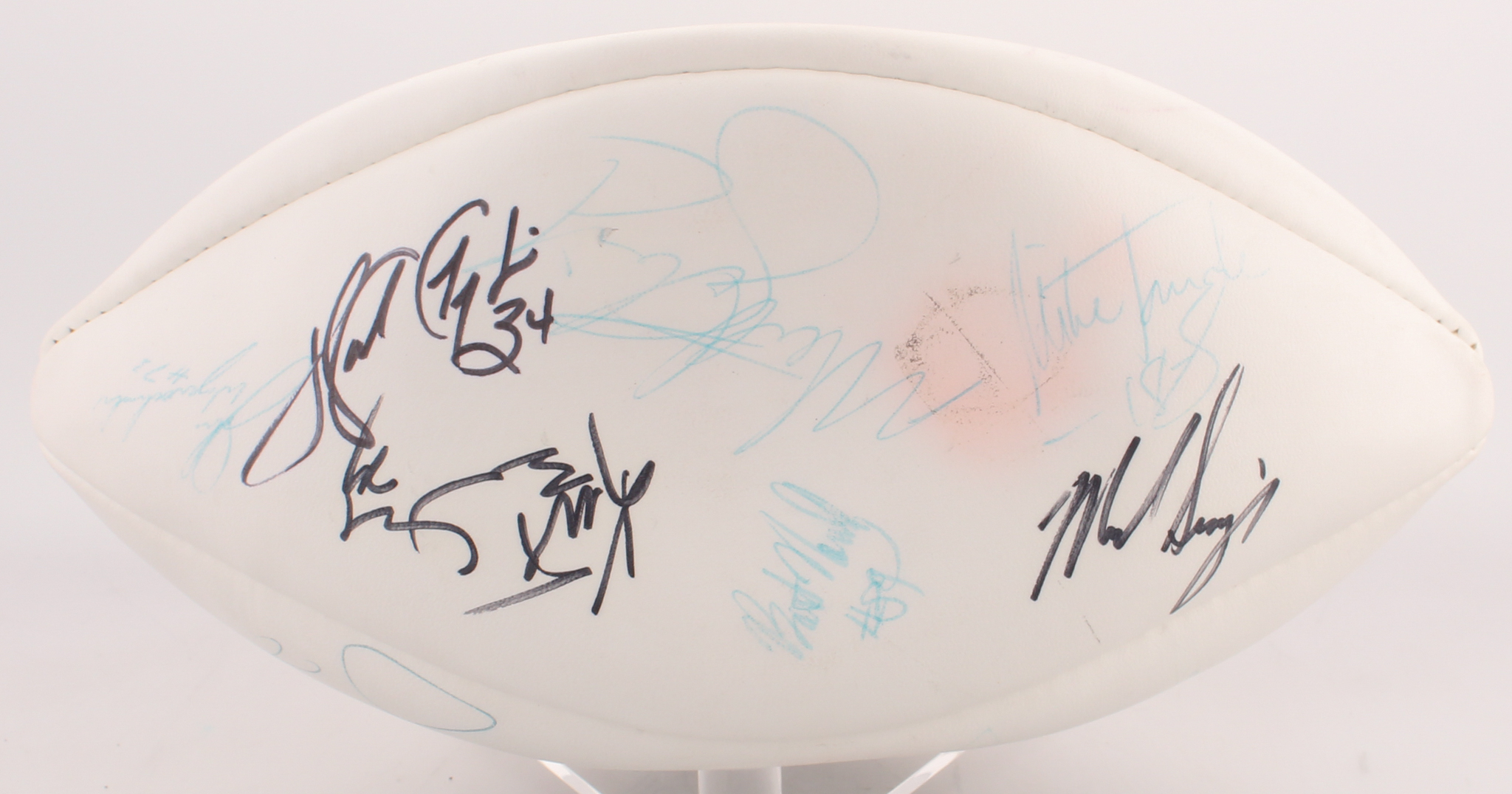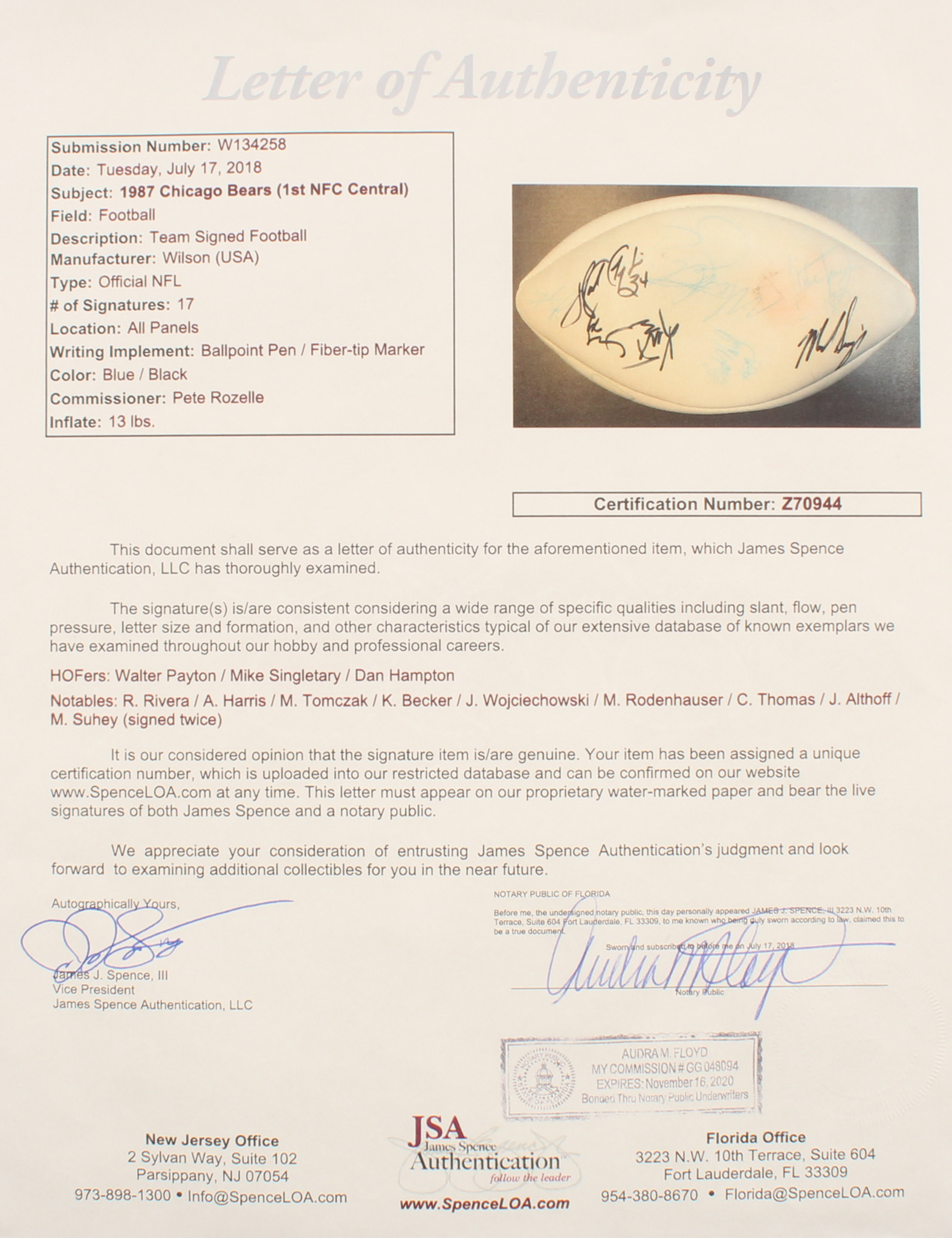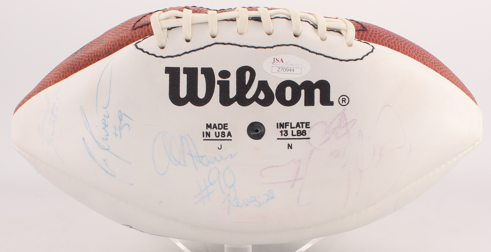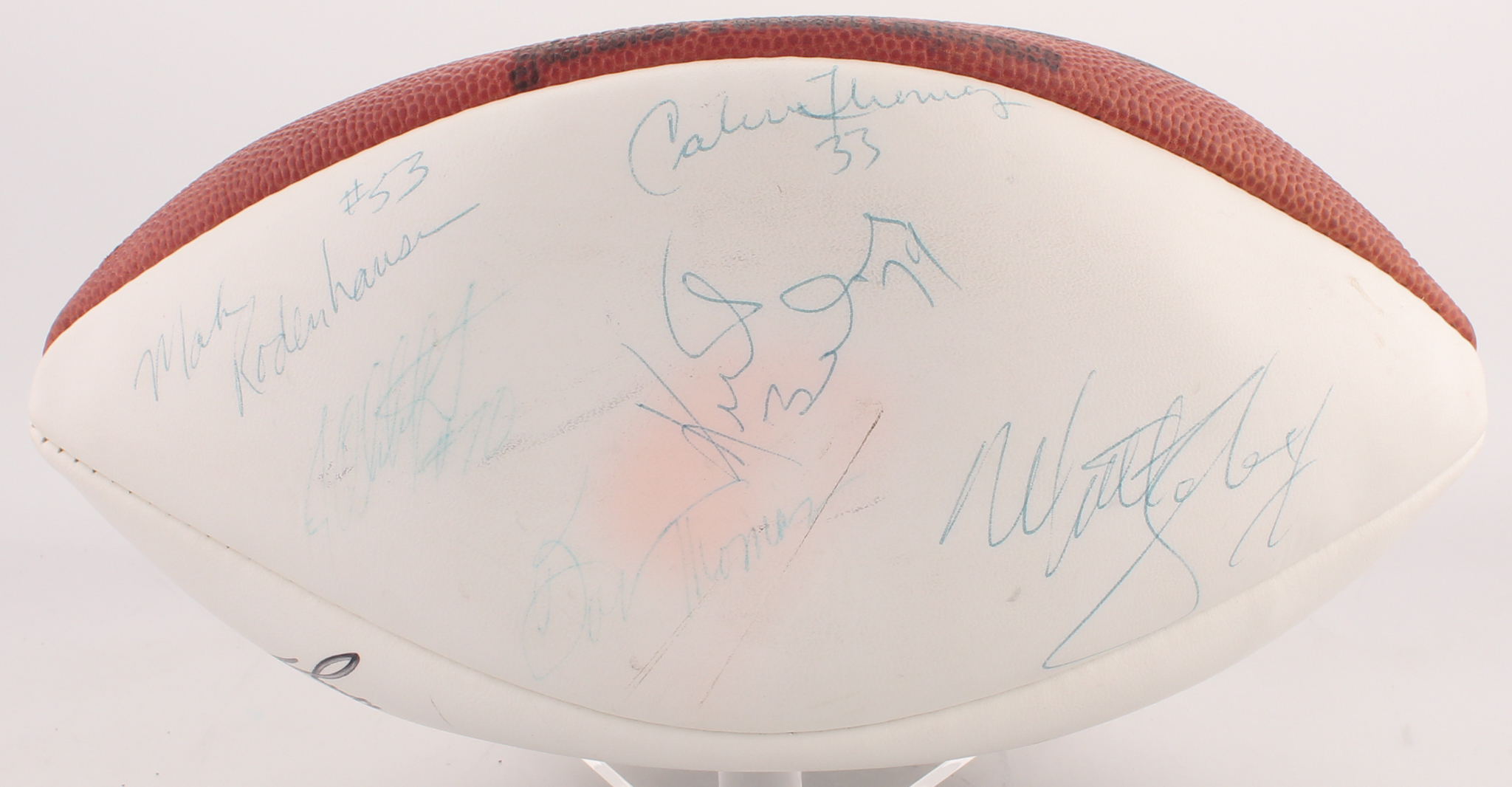 Wilson full-size football. Hand-signed in black and blue felt-tip and ink pens by (17) members of the 1987 Chicago Bears including Walter Payton, Mike Singletary, Dan Hampton, Ron Rivera, Archie Harris, Mike Tomczak, Kurt Becker, John Wojciechowski, Calvin Thomas, Jim Althoff, Matt Suhey, and others. Please note, ball does not inflate but holds air for display purposes.