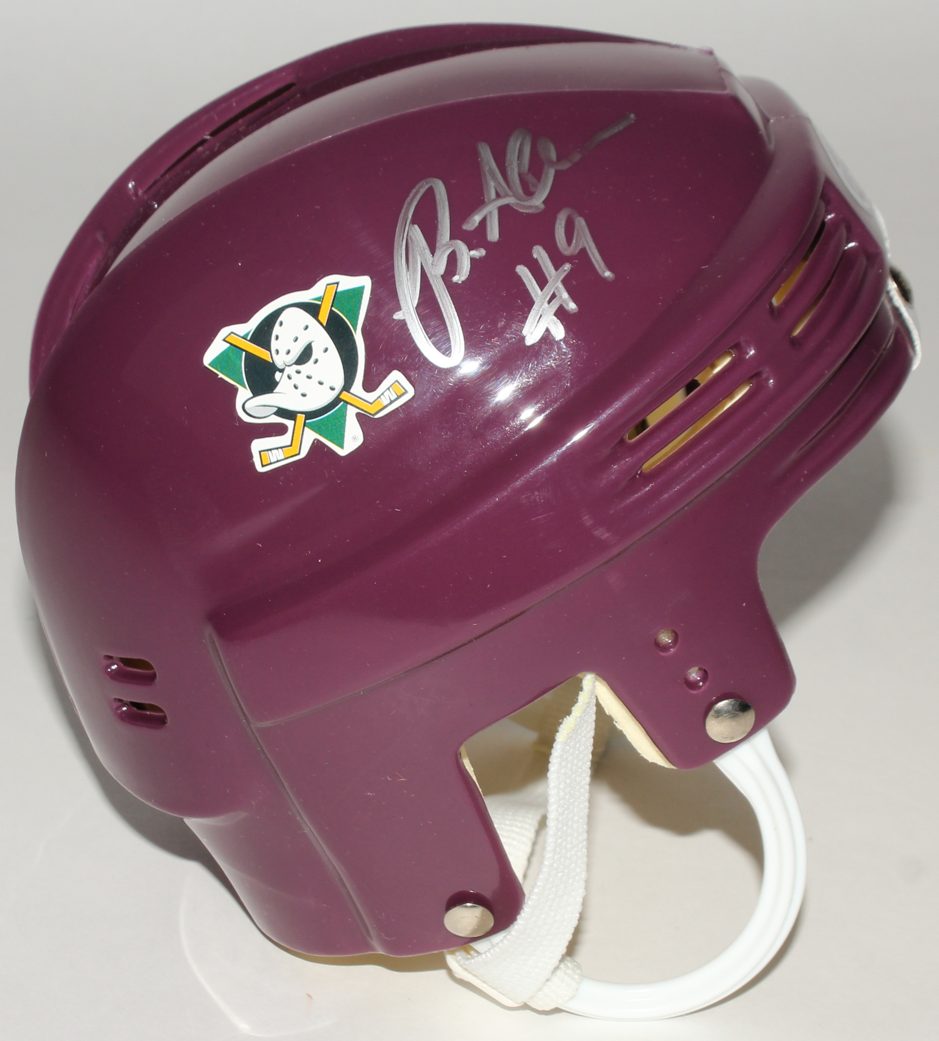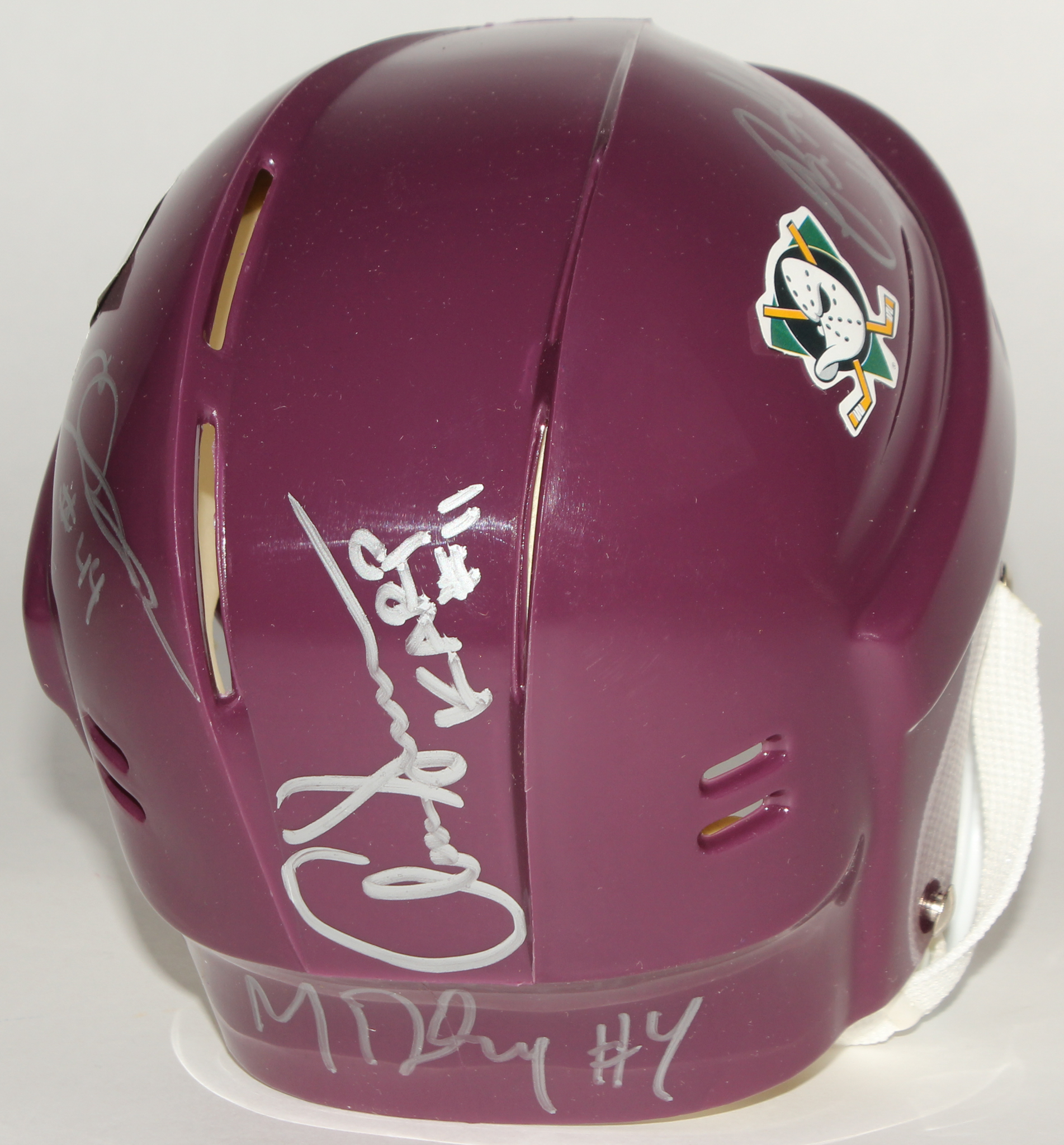 NHL "The Mighty Ducks" mini helmet. Hand-signed and inscribed in silver paint pen by (5) including Brandon Adams (Jesse Hall), Matt Doherty (Lester Averman), Elden Henson (Fulton Reed), Aaron Schwartz (Dave Karp), and Garette Ratliff Henson (Guy Germaine).