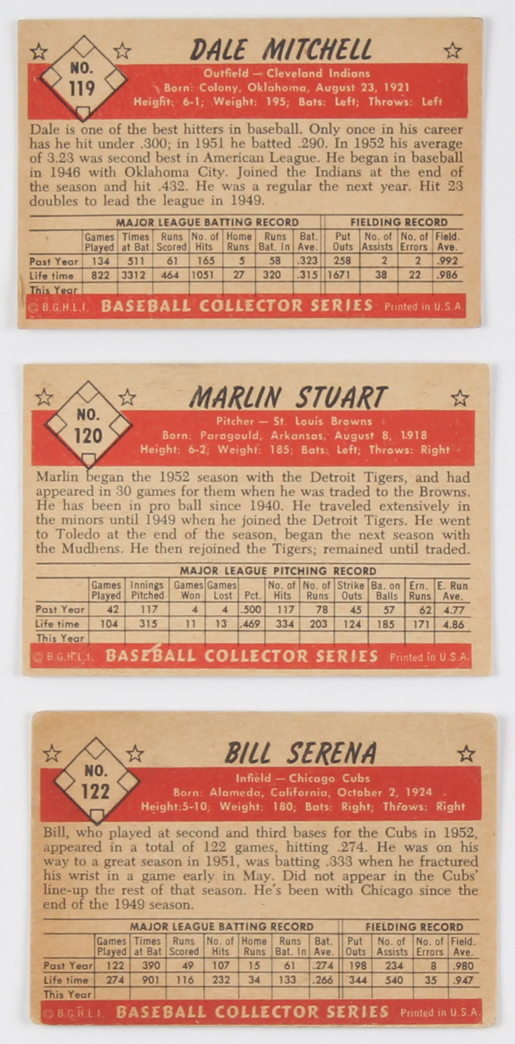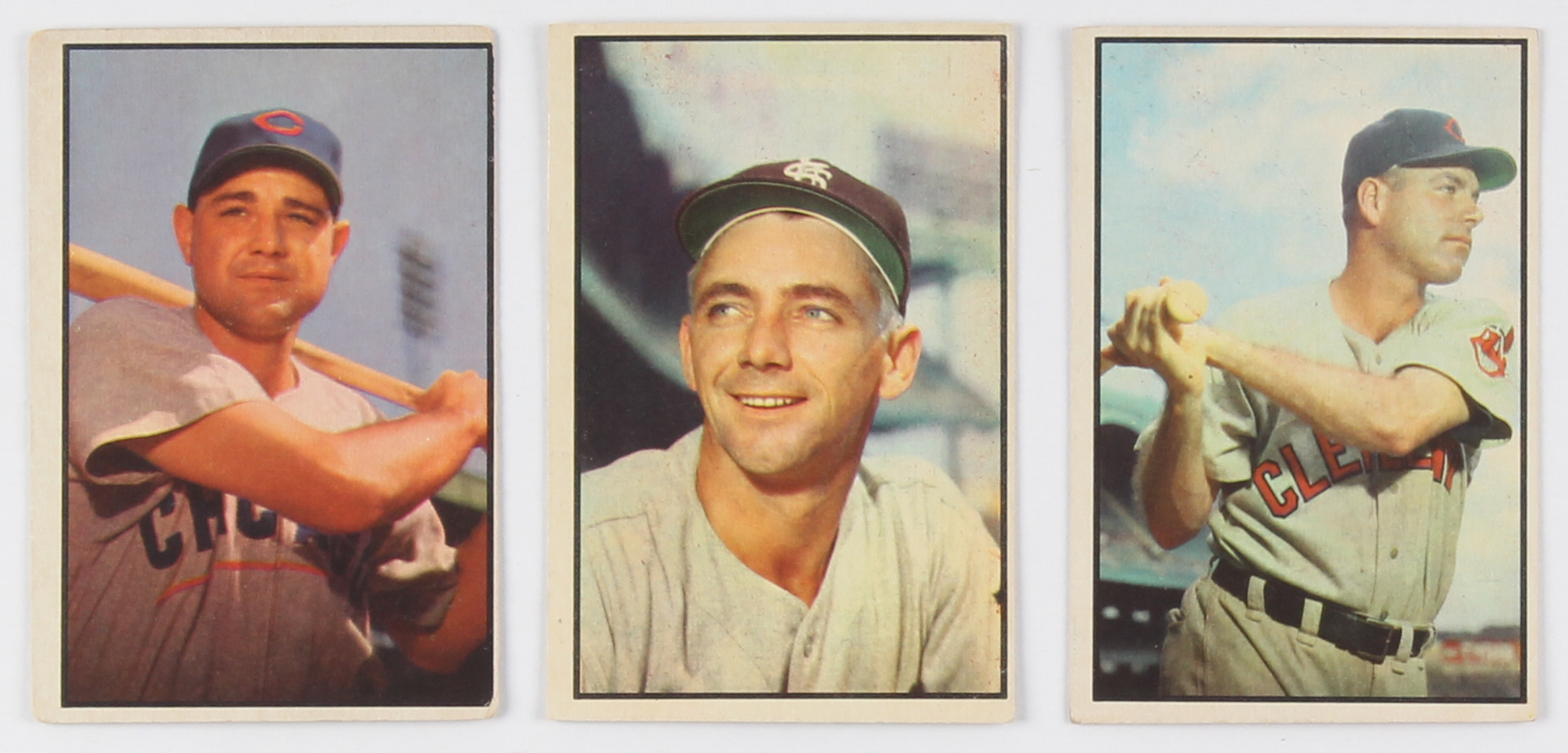 Lot of (3) 1953 Bowman Color Baseball Cards With #119 Dale Mitchell, #120 Marlin Stuart, #122 Bill Serena