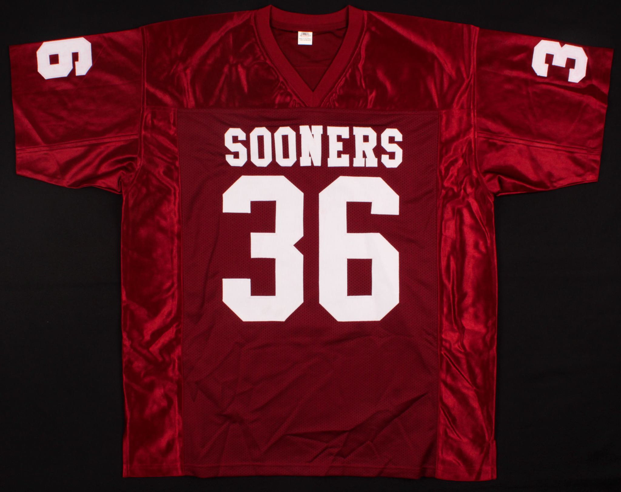 Custom on-field style jersey. Everything is sewn on, size XL. Hand-signed in black felt-tip pen by Steve Owens.