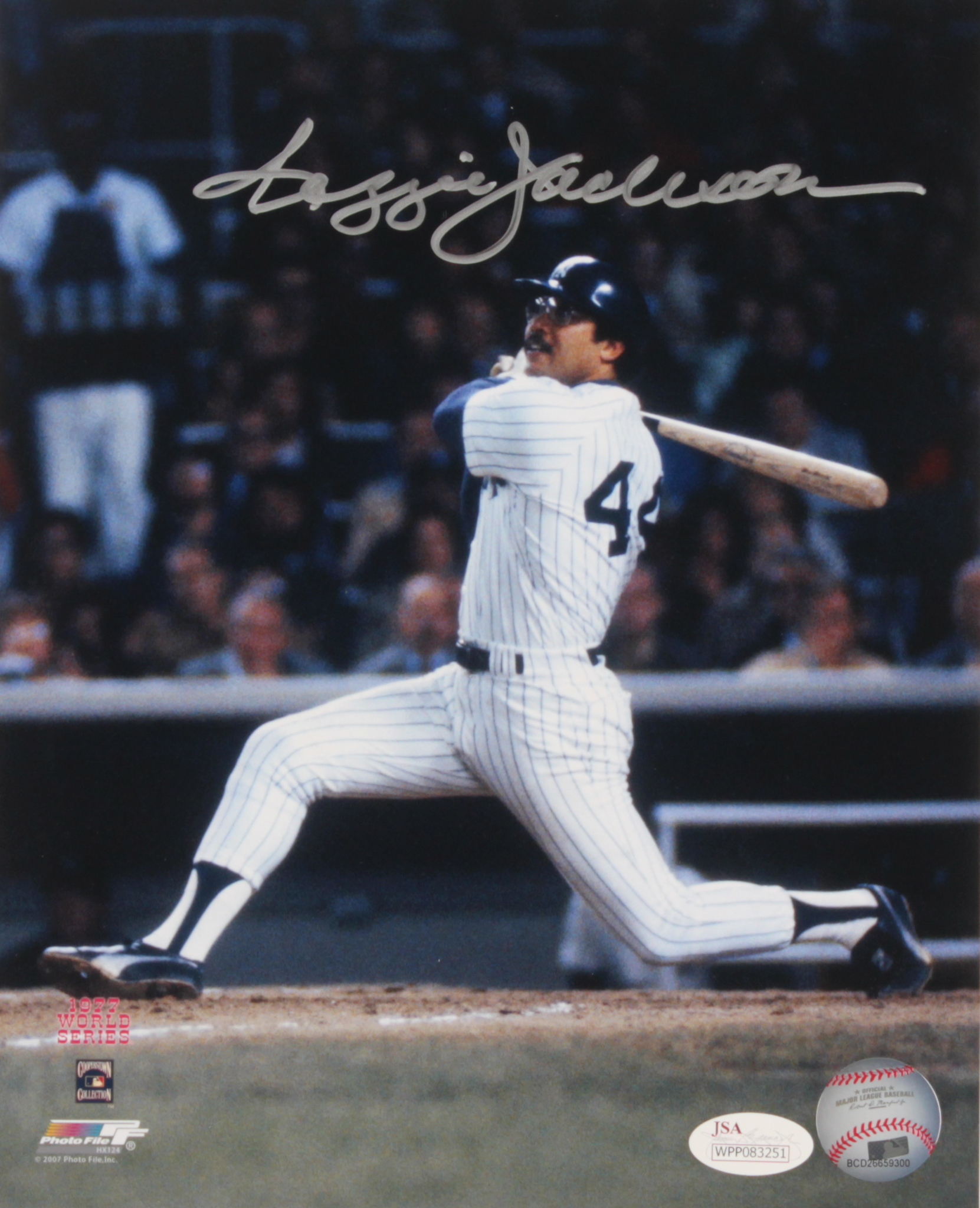 Photo measures 8" x 10" in size and has been hand-signed in silver paint pen by Reggie Jackson.