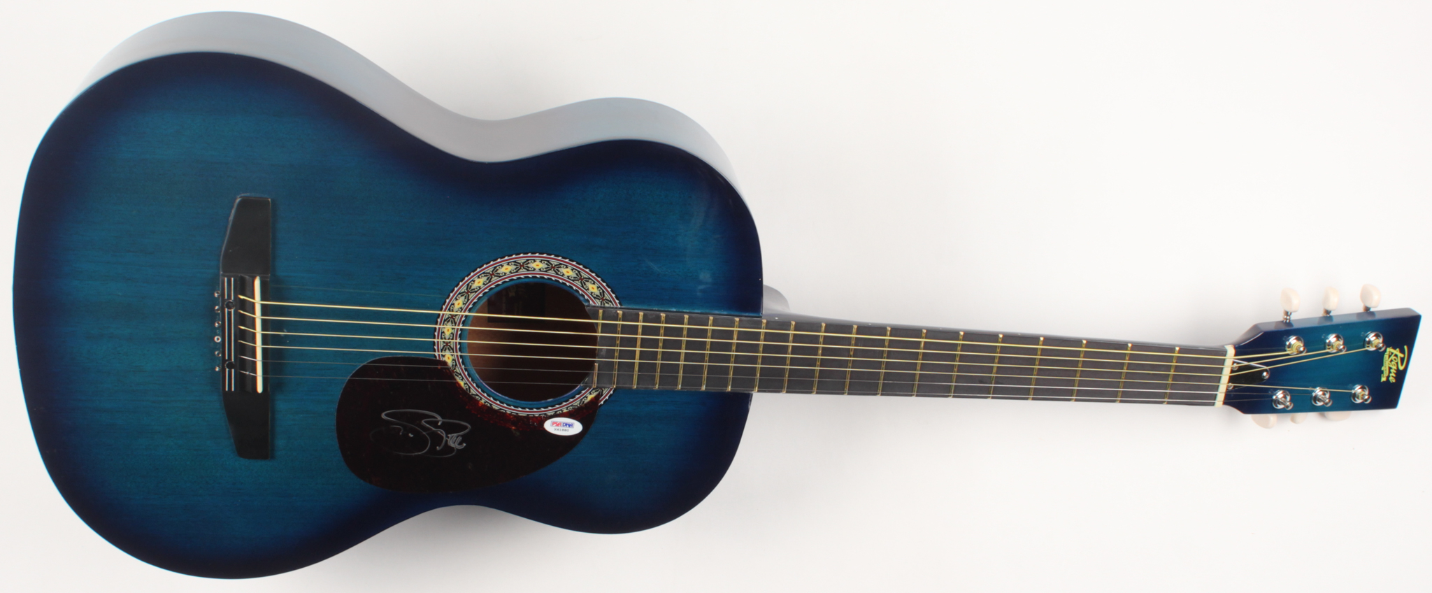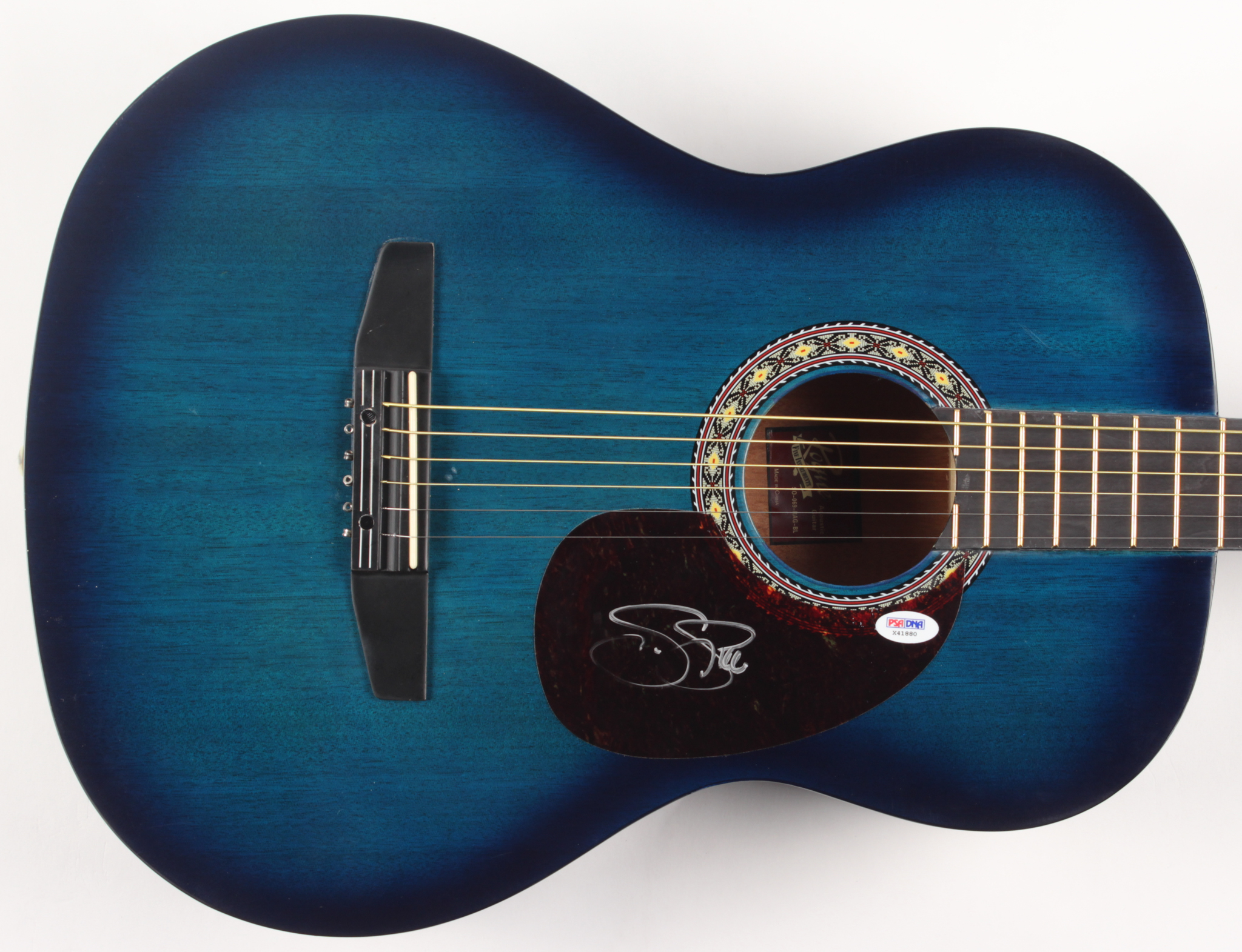 Full-size acoustic guitar, hand-signed on the pickguard in silver paint pen by Stephen Stills.