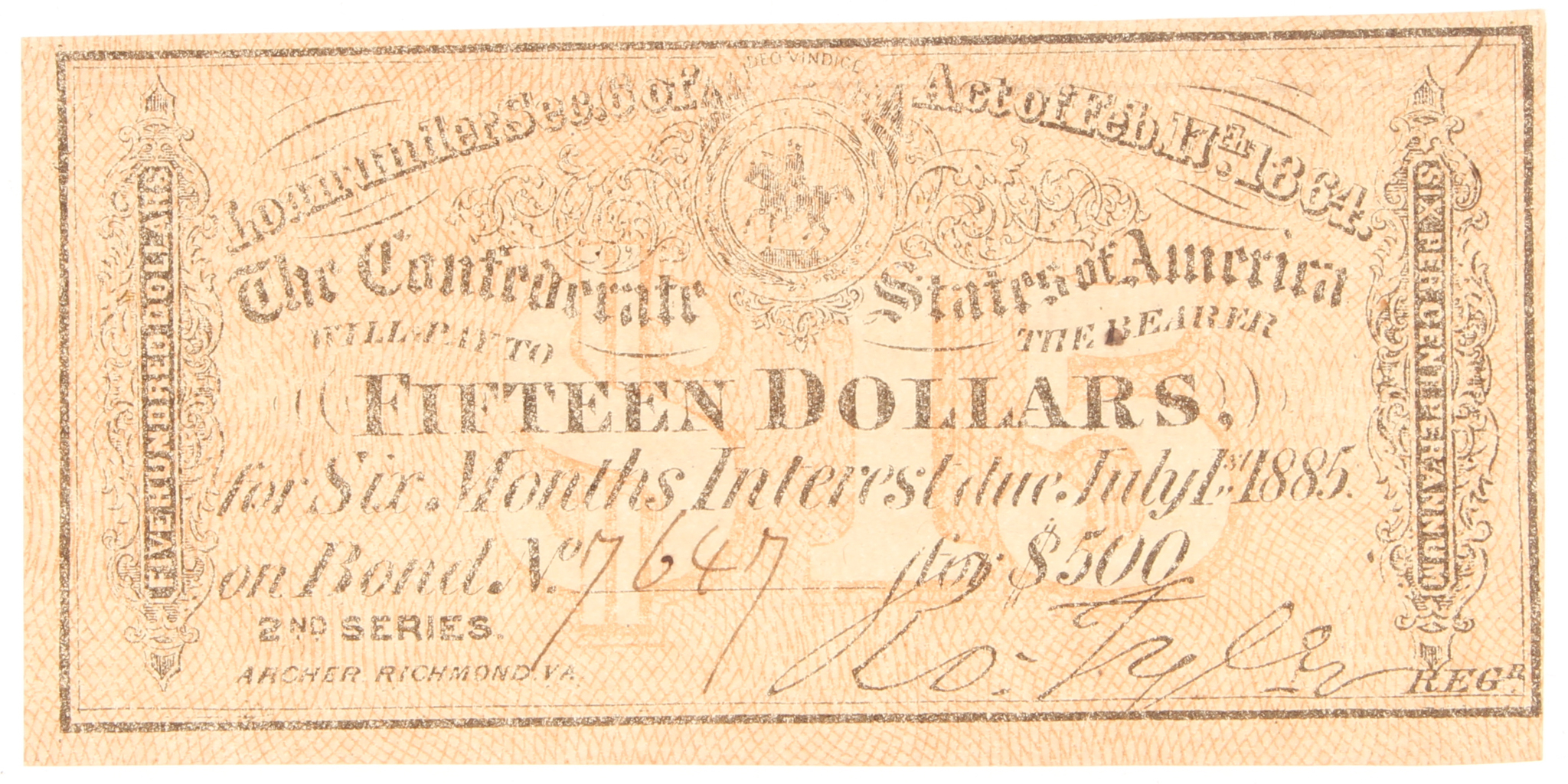 1885 $15 Fifteen Dollars Confederate States of America Bank Note Bill