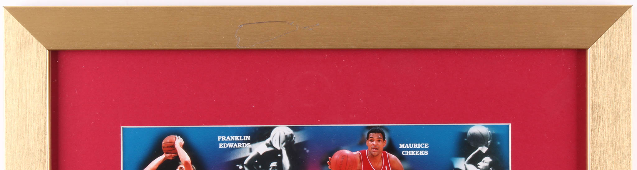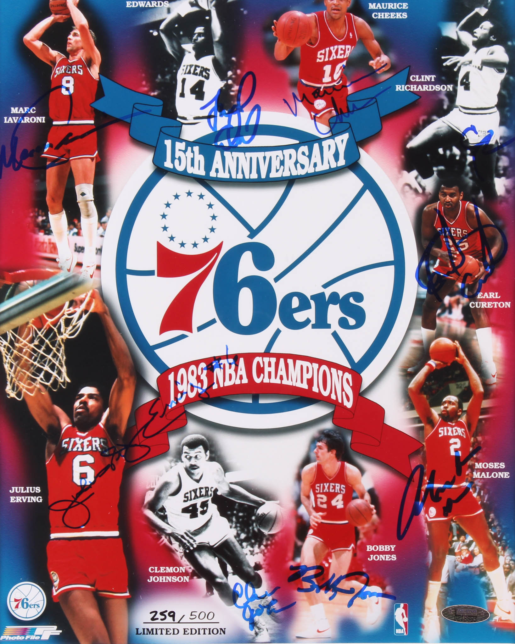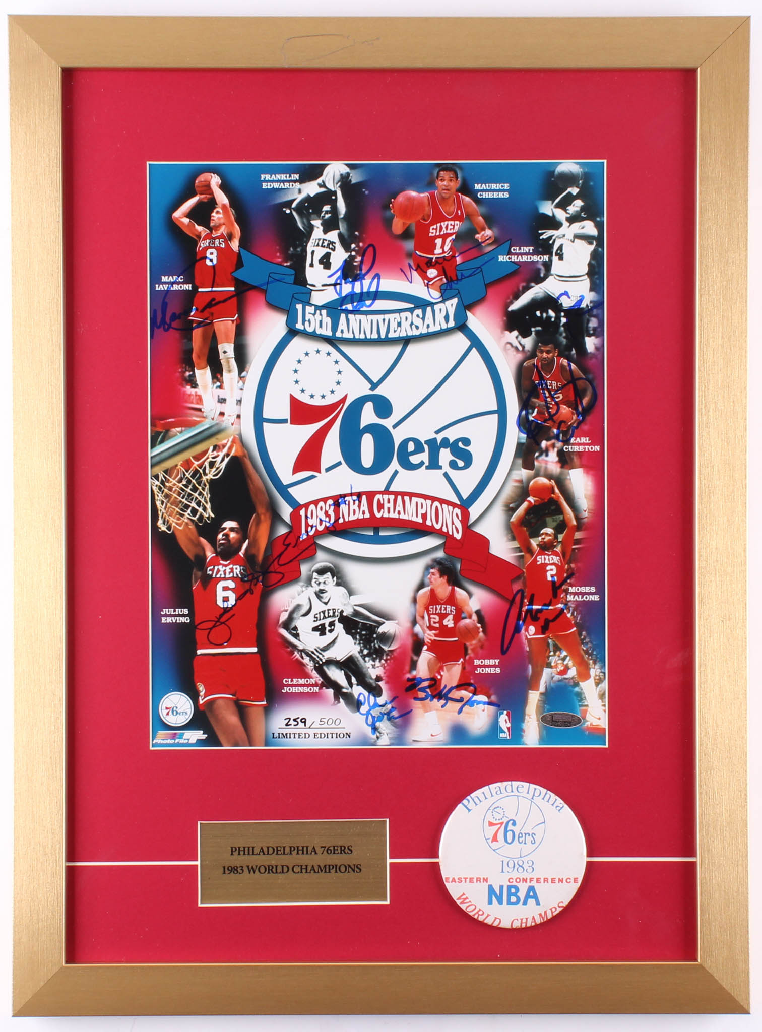 Custom framed display measures 17" x 23" in size and features a photo that has been team-signed in blue felt-tip by the 1983 NBA Champion 76ers. Including Julius Erving, Moses Malone, Maurice Cheeks, Bobby Jones, Clint Richardson, Clemon Johnson, Marc Iavaroni, Earl Cureton & Franklin Edwards. Display has been hand-numbered limited edition #448/500. Display also features a vintage 76ers NBA Champions pin.