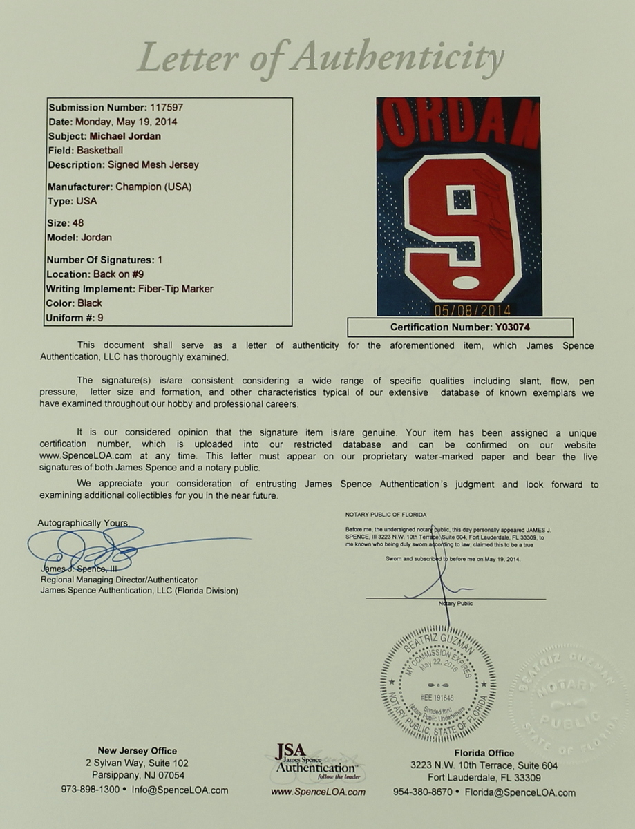 Champion on-court style Team USA jersey. Everything sewn on, size 48. Hand-signed in black felt-tip pen Michael Jordan (Bulls HOF).