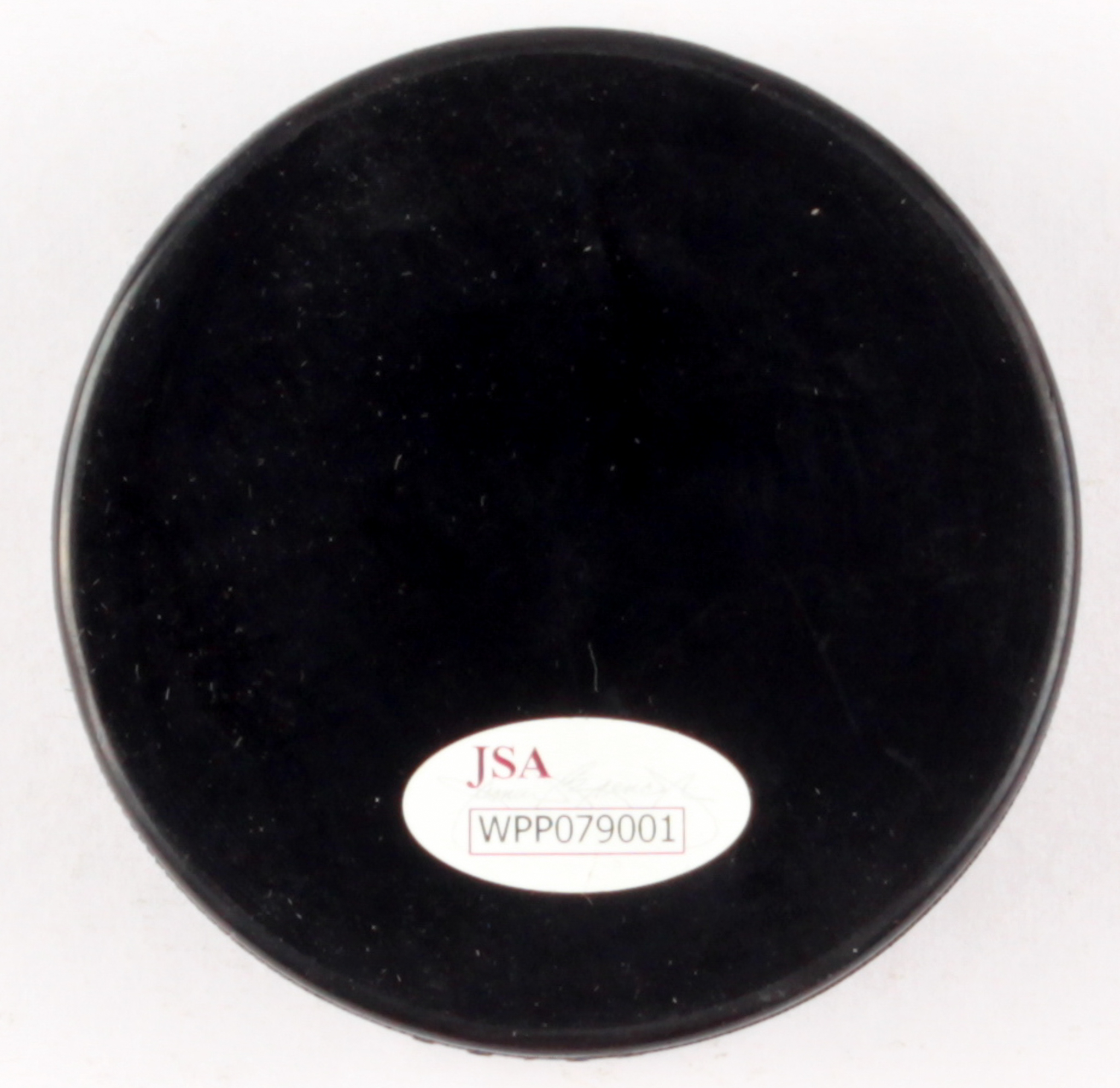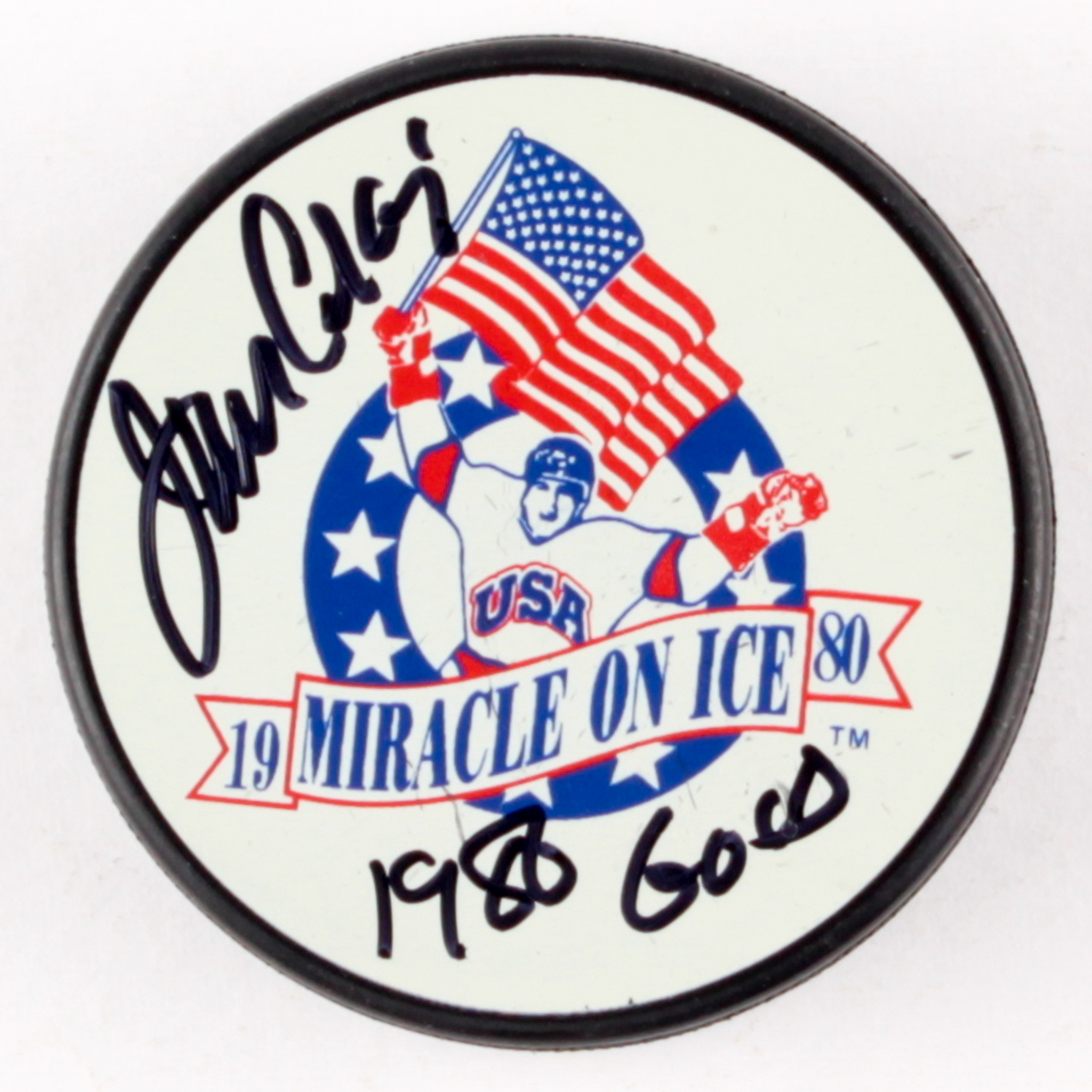 1980 Miracle On Ice logo hockey puck. Hand-signed and inscribed in black felt-tip pen by Jim Craig.