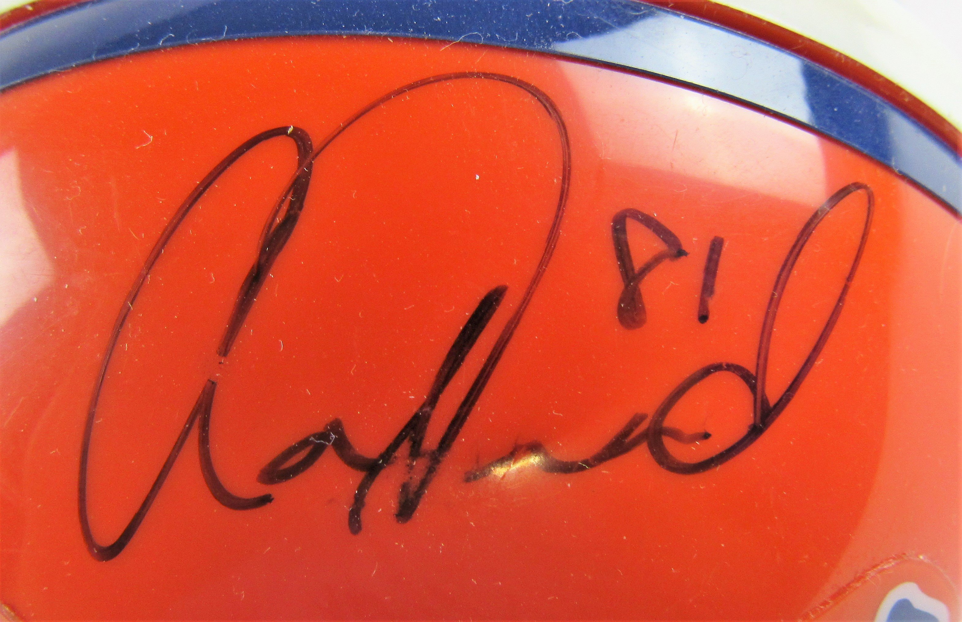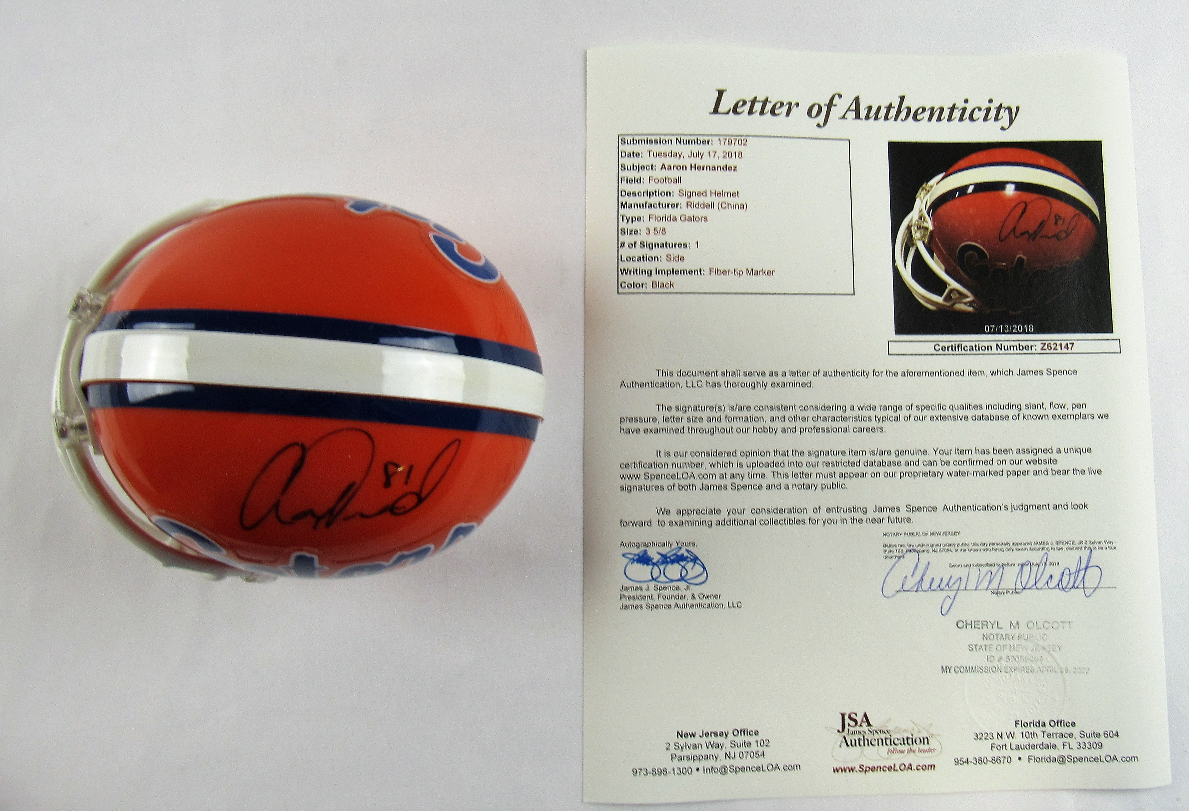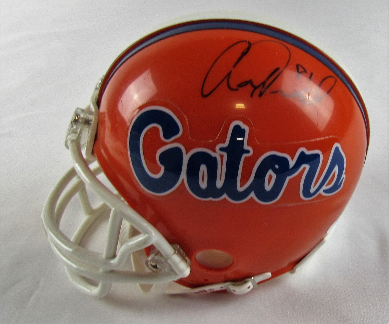 Riddell Florida Gators mini-helmet. Hand signed in black felt-tip pen by Aaron Hernandez, (D. 2017, Patriots).