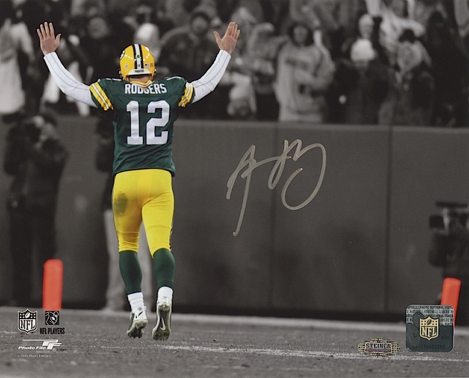 Photo measures 8" x 10" in size and has been hand-signed in silver paint pen by Aaron Rodgers. Autograph includes an official Steiner Sports hologram for authenticity purposes.